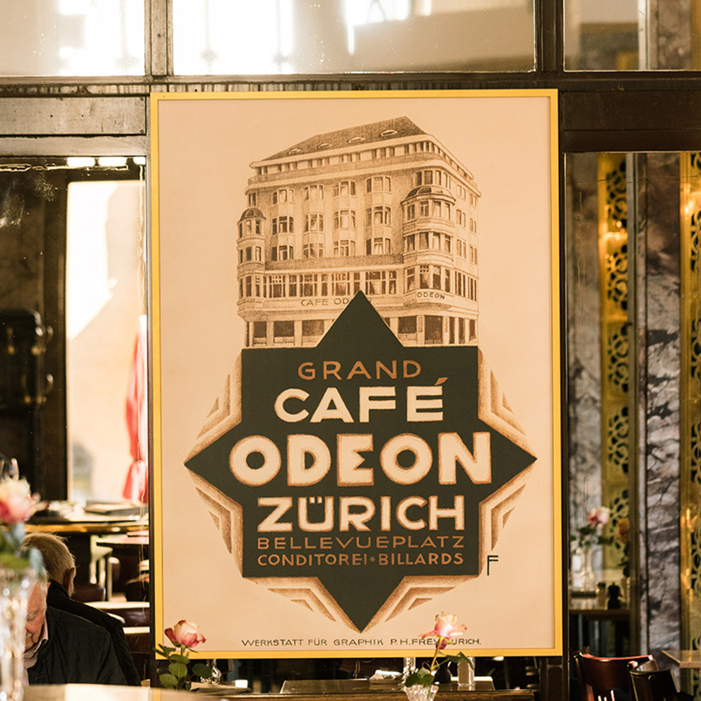Direkt am Bellevueplatz gelegen, zählt das 1911 eröffnete Café ODEON – einst Treffpunkt berühmter Literaten, Musiker, Wissenschaftler und Politiker – aufgrund seiner Geschichte zu den spannendsten Cafés in Zürich. Seit 1972 steht diese Institution, in einem grosstädtischen Gebäudeensemble in zentraler Lage, unter Denkmalschutz.