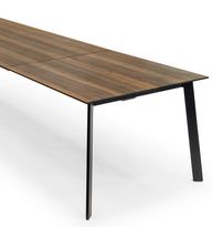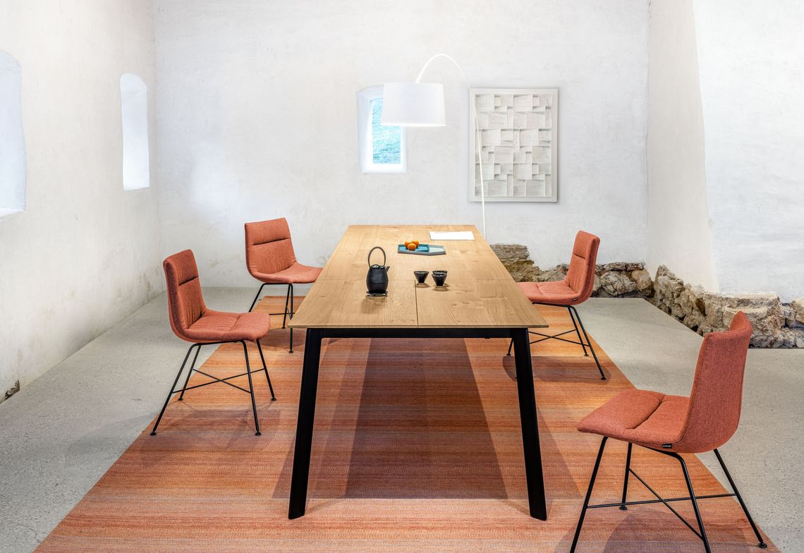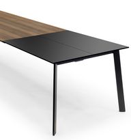 Eine gedämpfte Ausschwenktechnik erleichtert die Handhabung beim Öffnen der Klappeinlage. Die längs verlaufende Holzmaserung des Tischblatts setzt sich in den Einlageplatten fort.