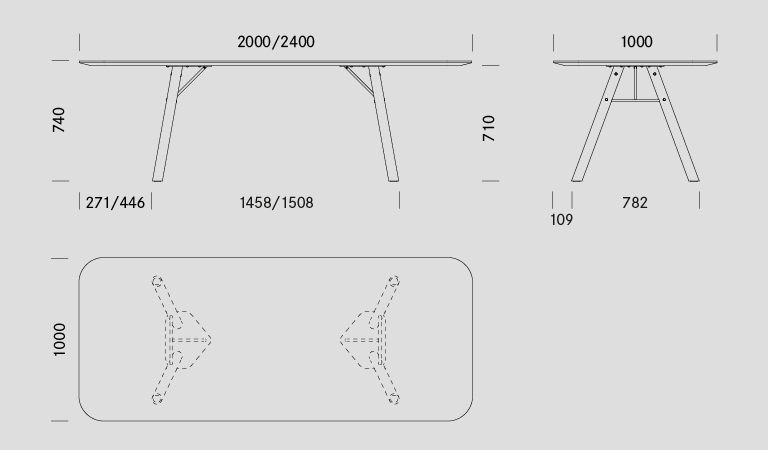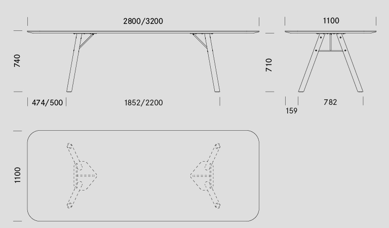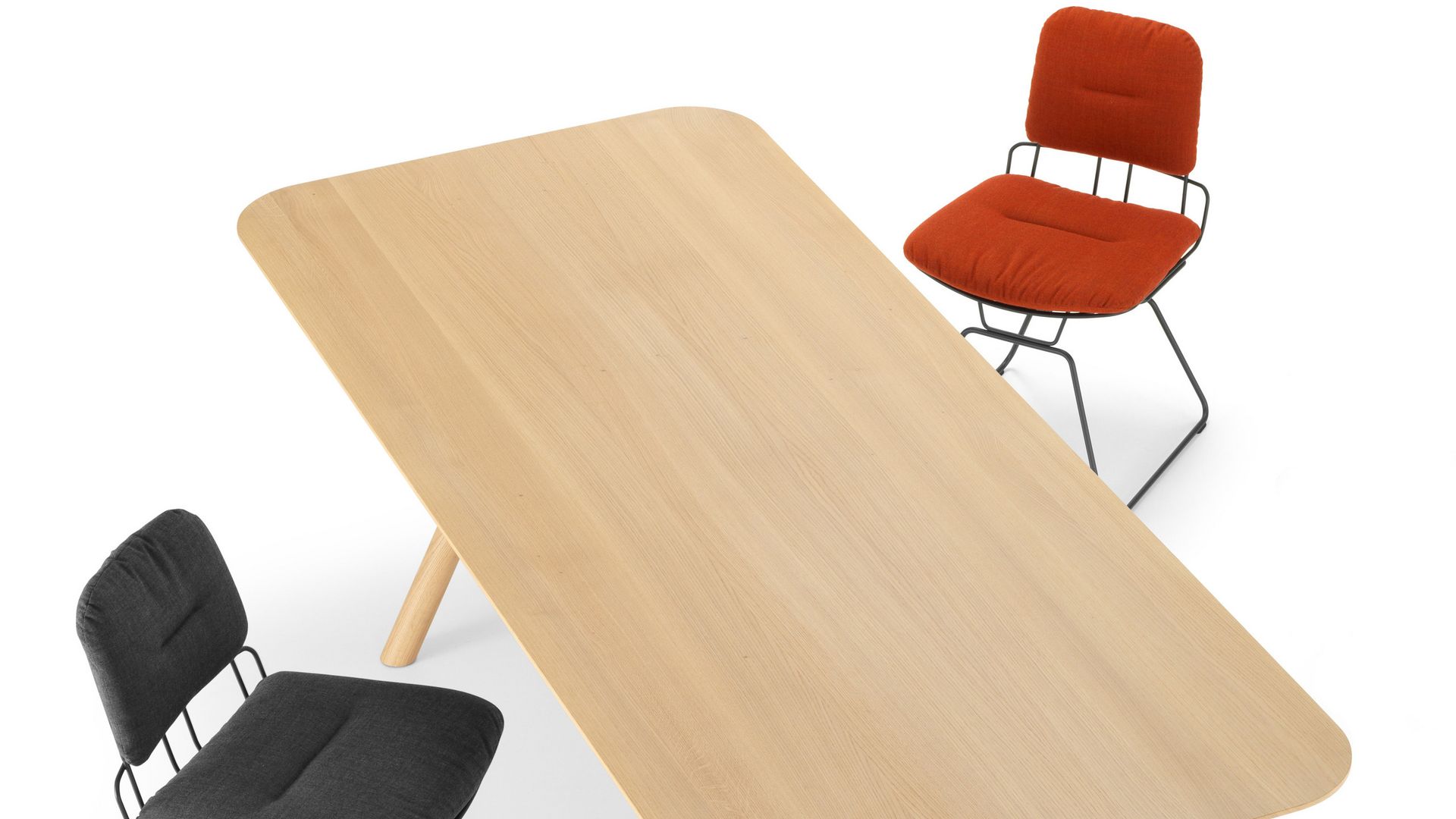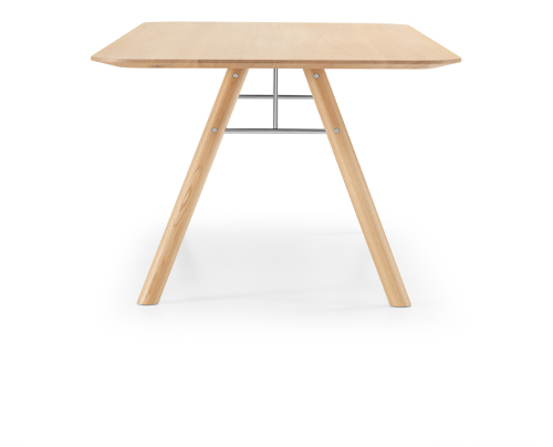 Das markante Designmerkmal von Akio sind Stahlkreuze, welche die schräg angestellten Massivholzbeine aussteifen und dadurch grosse – wahlweise runde, ovale oder rechteckige – Tischplattenformate bis zu einer Länge von 320 cm ermöglichen. Nach aussen hin sind die Kanten der Massivholzplatten abgeschrägt und tragen zu einer optischen Leichtigkeit bei.