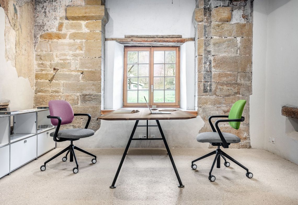 Akio Steel Besprechungstisch rechteckig und Marel Drehstuhl mit schwarzem Viersternfuss im Besprechungsraum