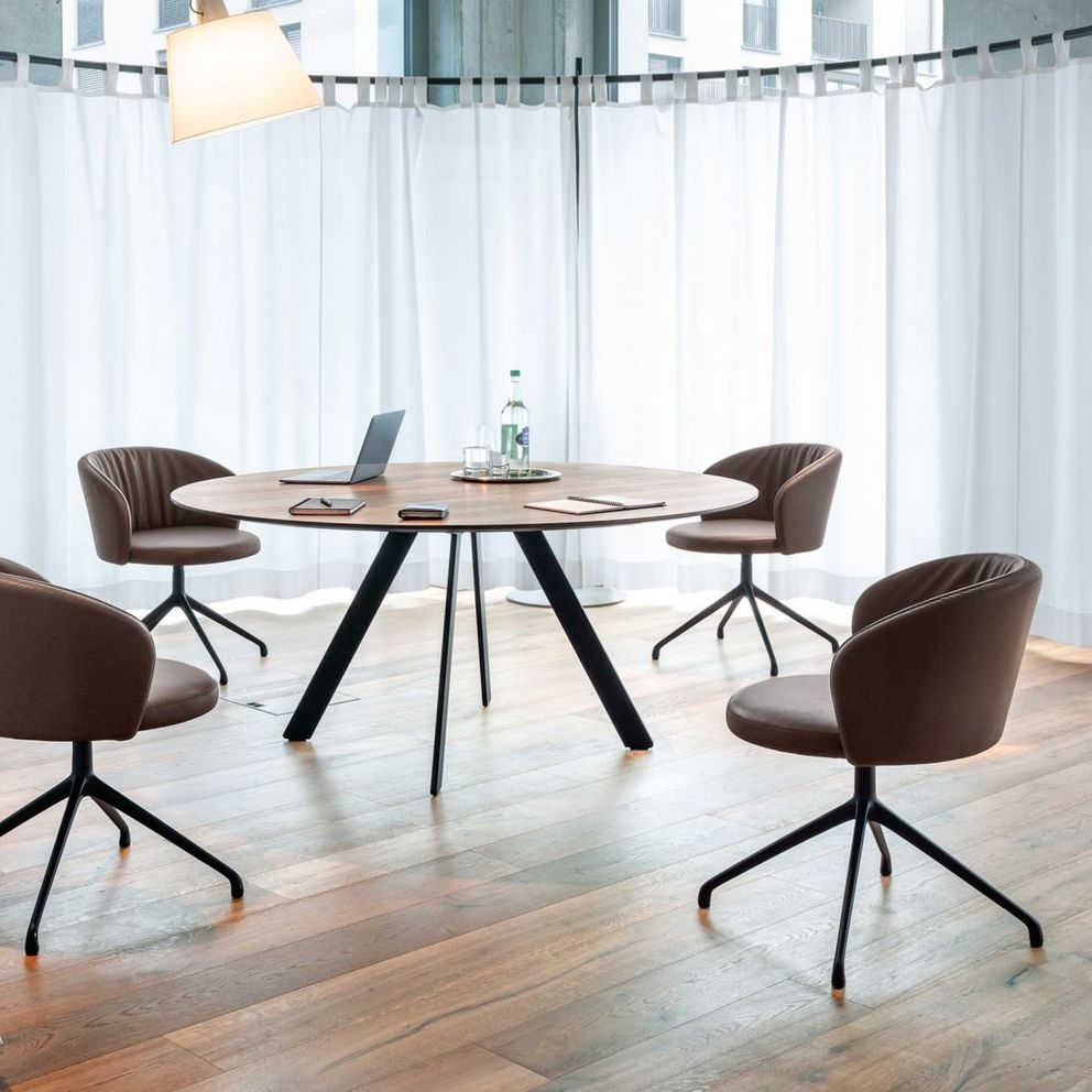 Das scheinbar schwebende runde Tischblatt des Barra Rundtisches liegt auf einem Zentralfussgestell aus Flachstahl. Dank der schräg angestellten Beine ergibt sich eine sehr gute Stabilität des Tisches.