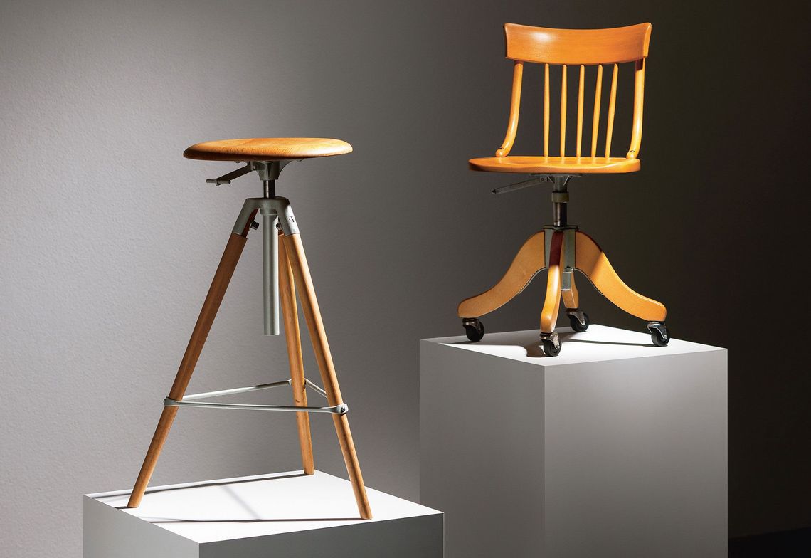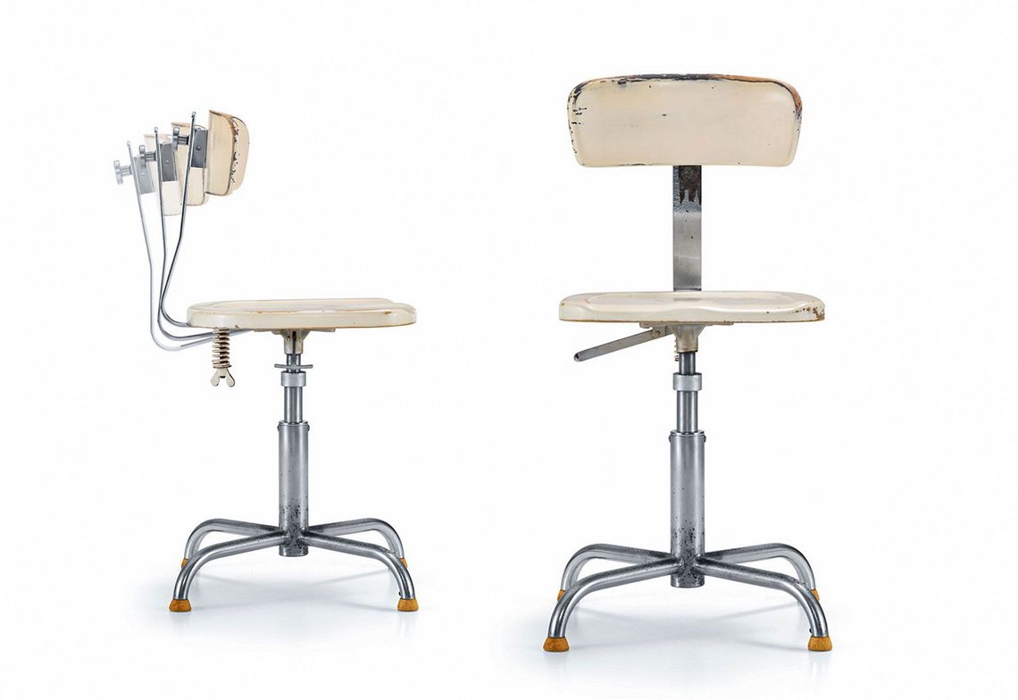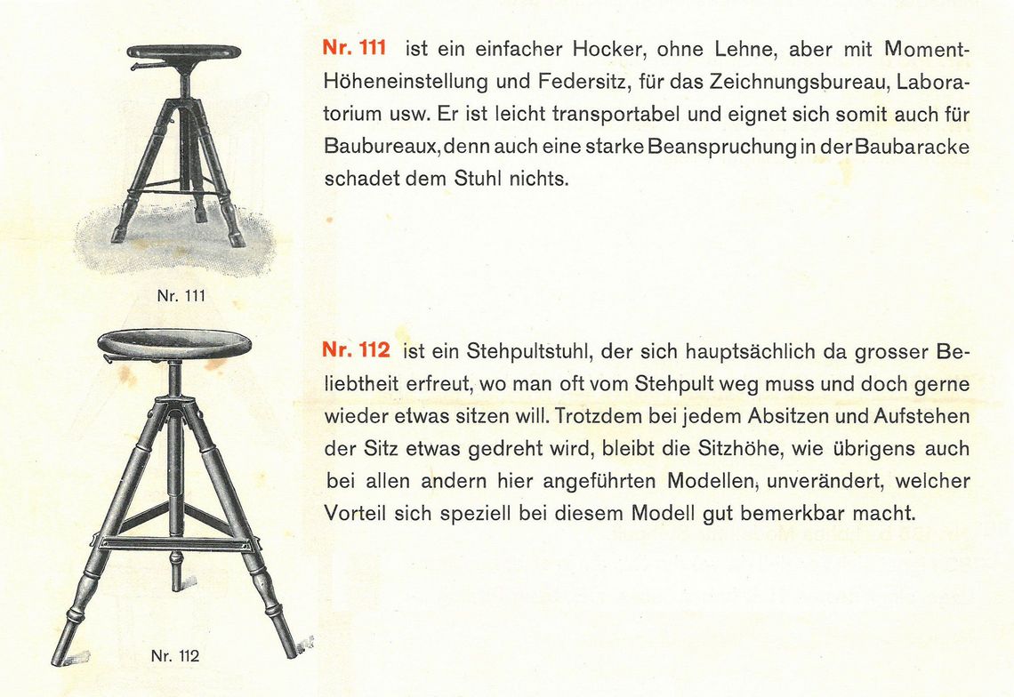 In der hier gezeigten Ausführung wurde dieser Hocker als „Modell 111" sechzig Jahre lang produziert – bis 1970. In der Folge entstanden bereits ab 1912 erste Bürodrehstühle mit gezielter und beweglicher Lendenwirbelunterstützung.