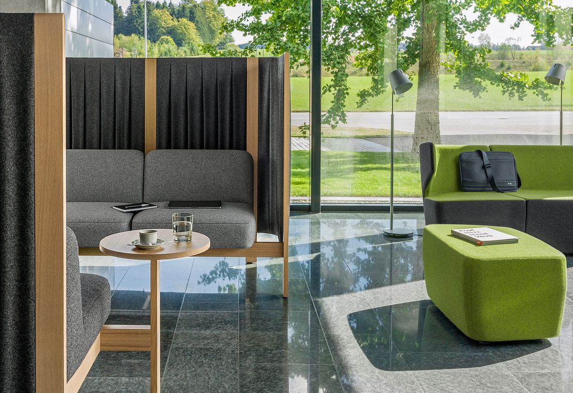 Sound-absorbing properties and visual discretion are often desired in lounge areas, and enable private conversations to take place. As quieter spaces, they provide a much-needed opportunity to switch off.