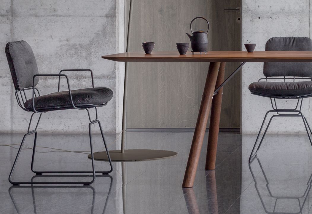 The most striking design feature of Akio is the steel struts, which give the angled solid wood legs greater stability and thus enable larger table top formats – either round, oval or rectangular – up to 320 cm in length. The edges of the solid wood tabletops are bevelled outwards, helping to create an appearance of lightness.