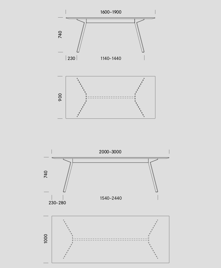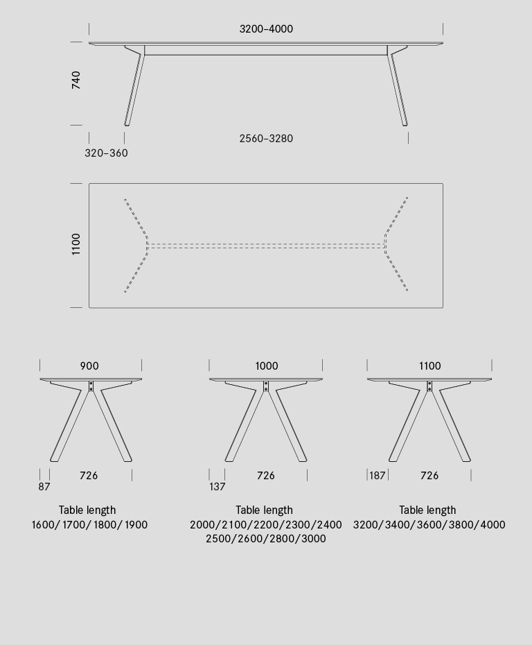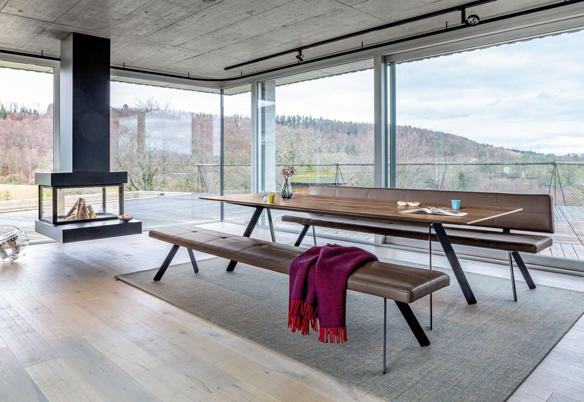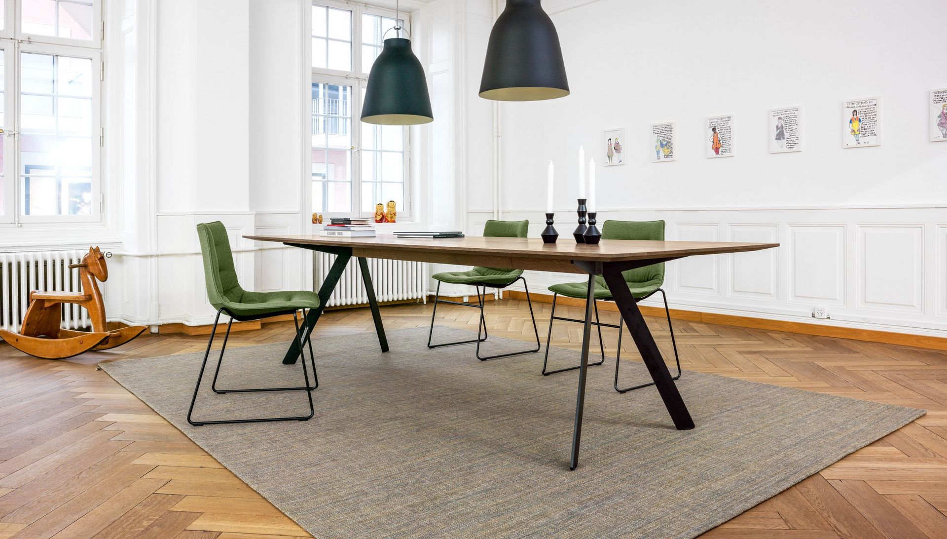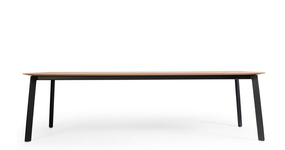 Barra combines a streamlined form with construction logic. While appearing to float, the tabletop rests on a solid wood beam that provides it with central support and incorporates the pairs of legs at each end. These angled legs provide the table with excellent stability and enable lengths of up to 400 cm.
