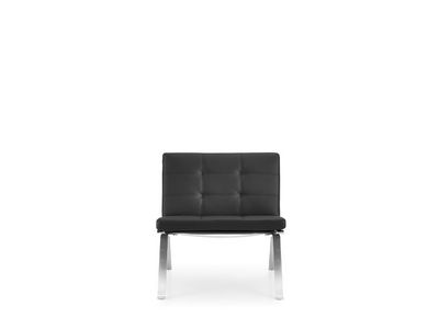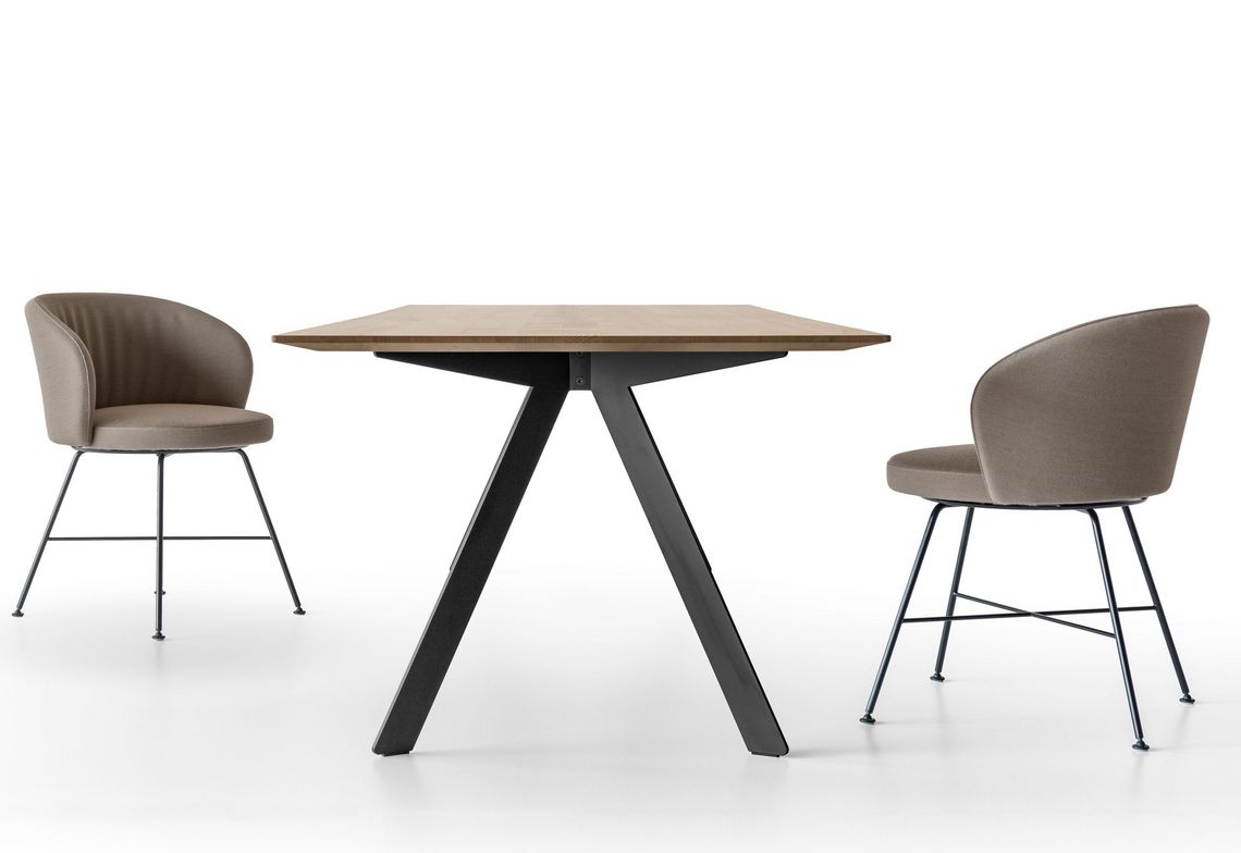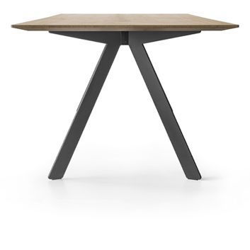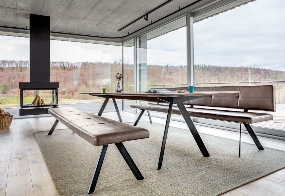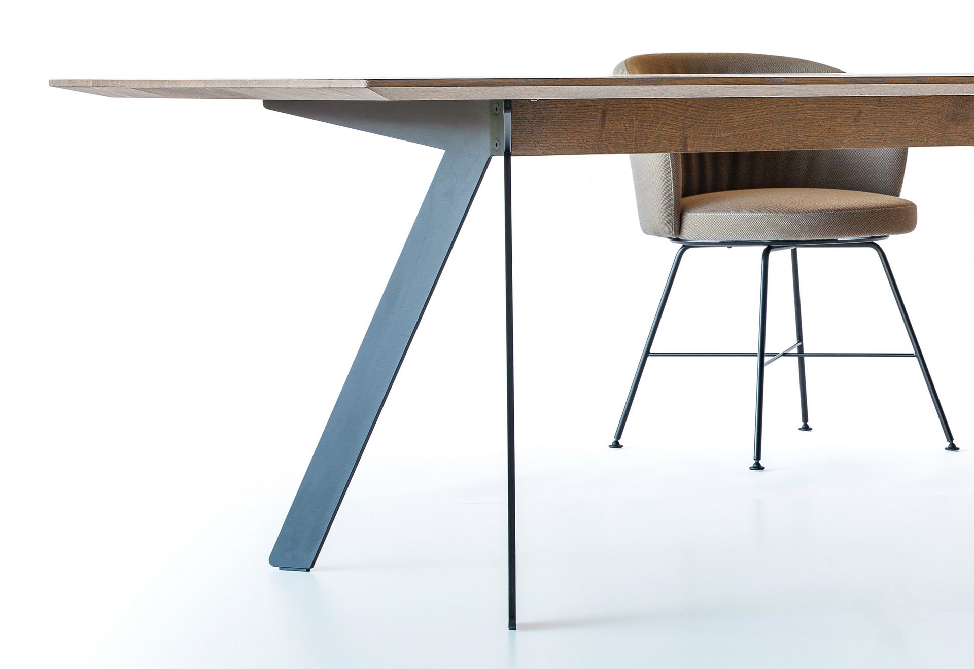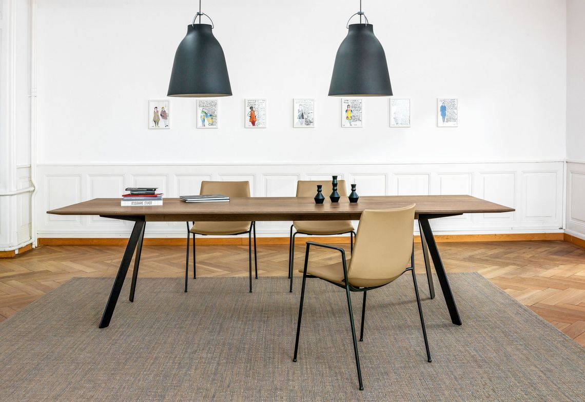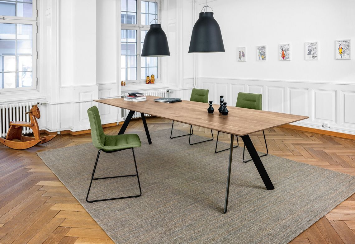 The angled position of the flat steel table legs stabilizes the frame structure lengthwise and crosswise, enabling the use of materials just 10 mm thick. Visually, this creates a particular slender and elegant silhouette.