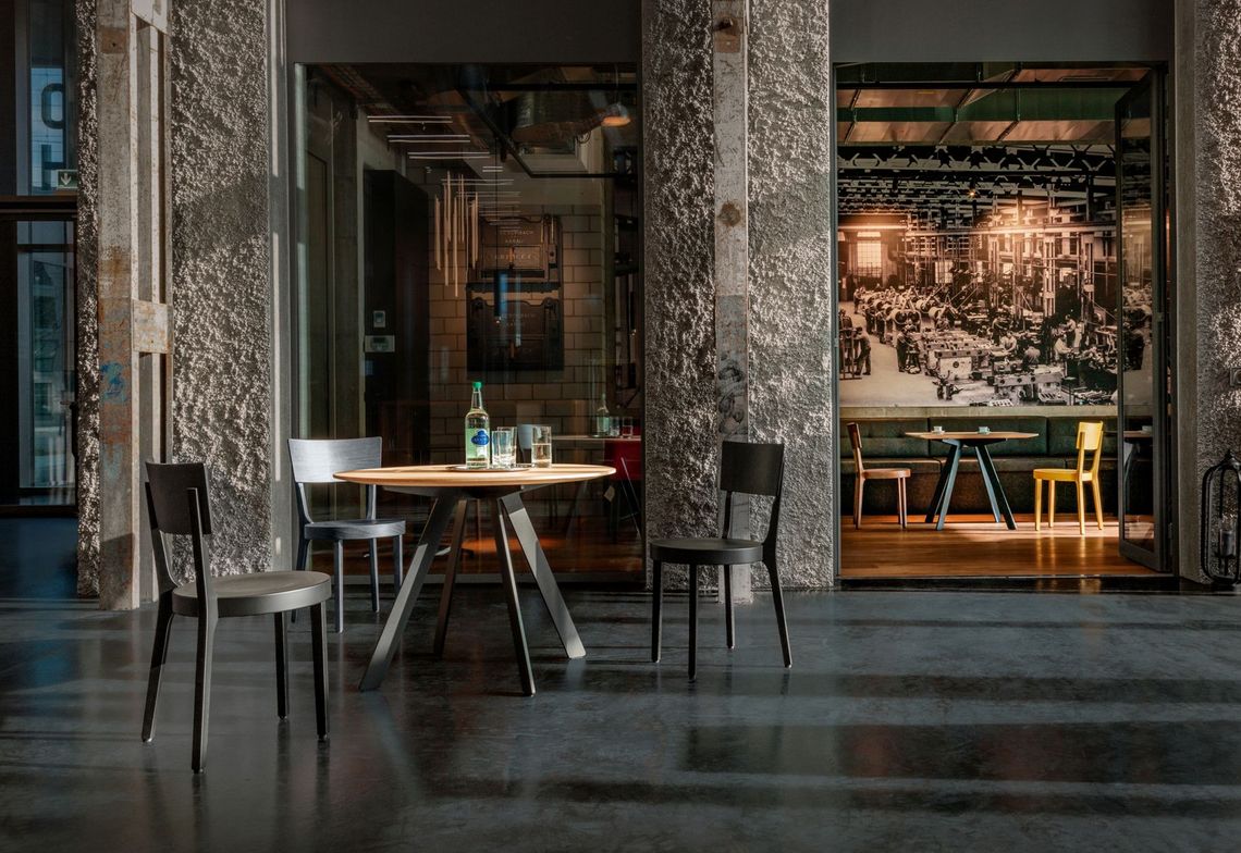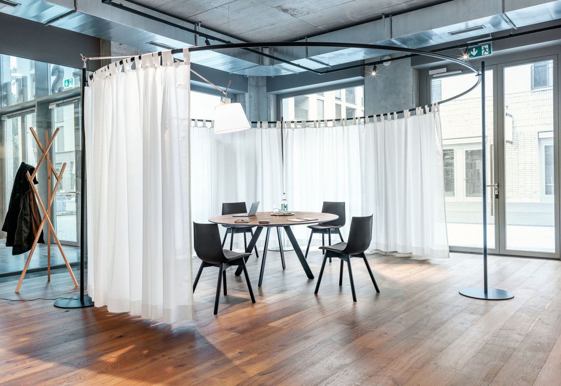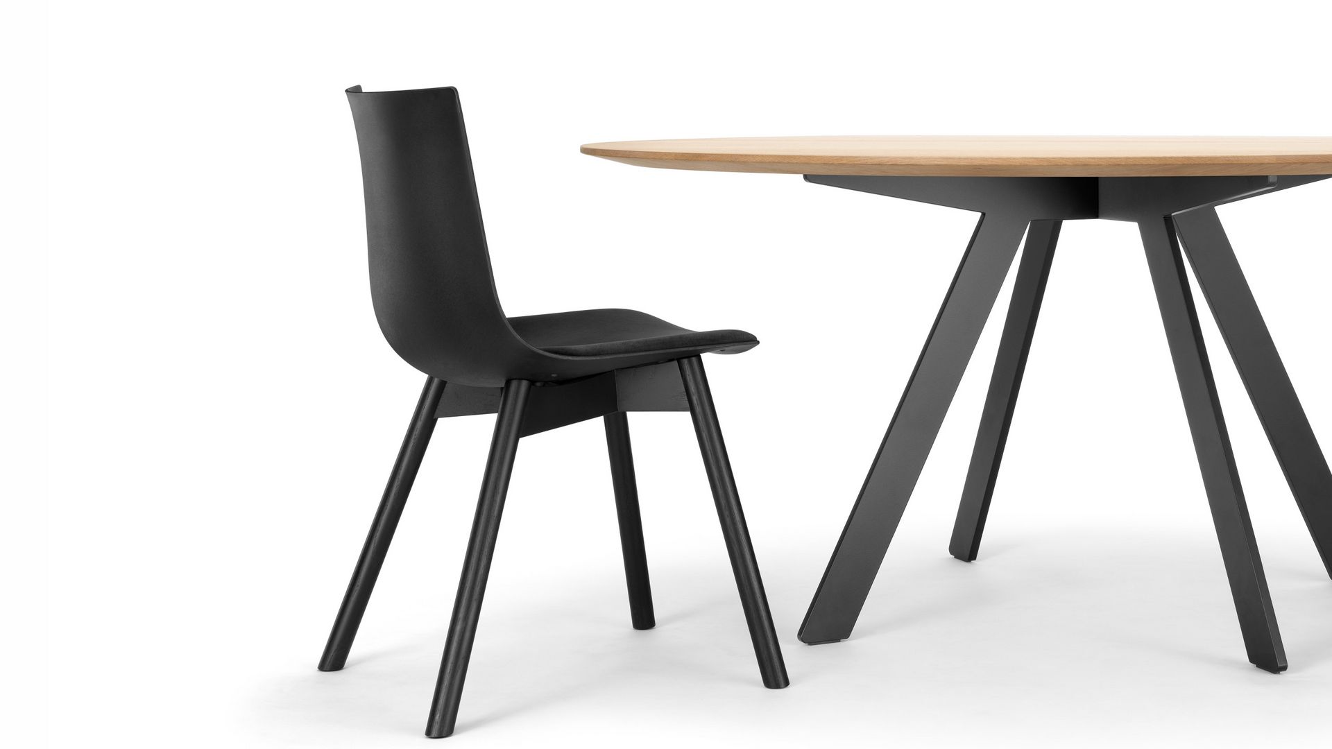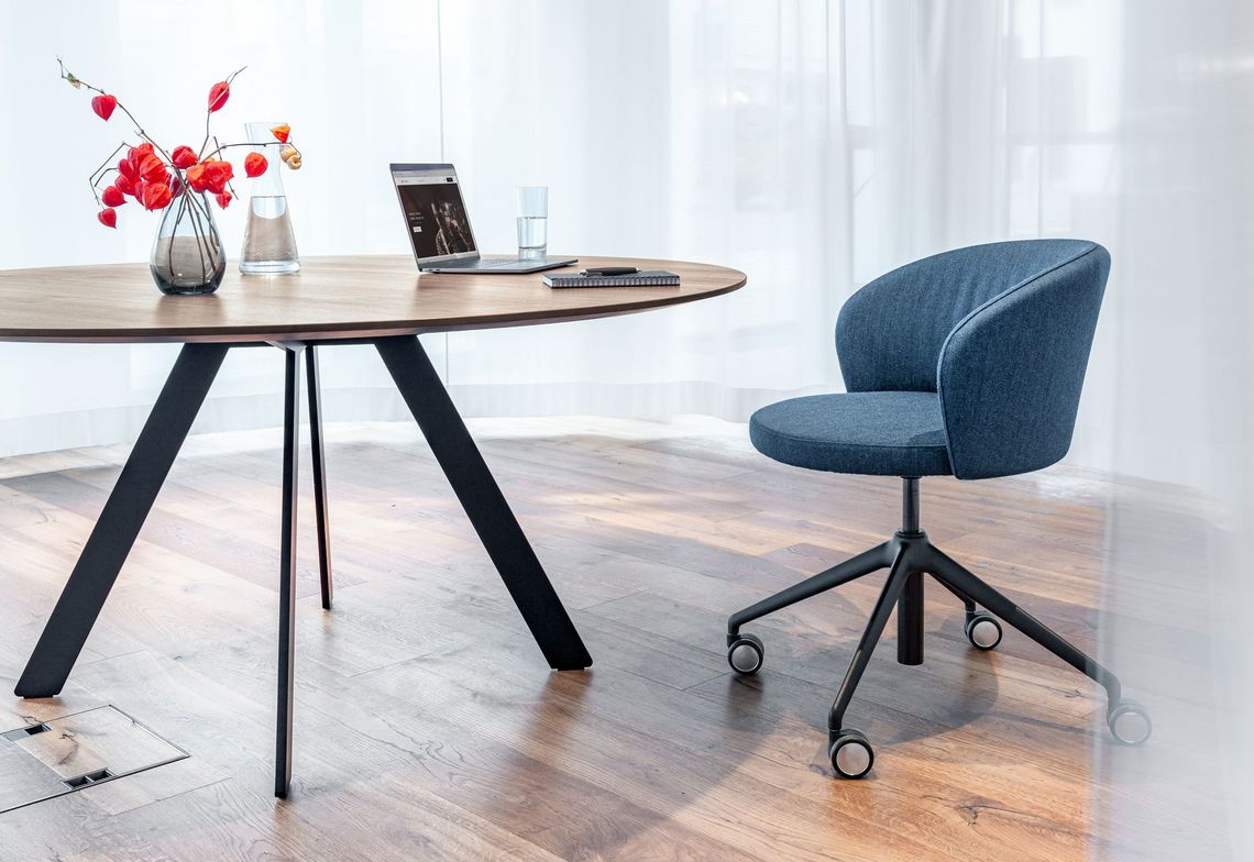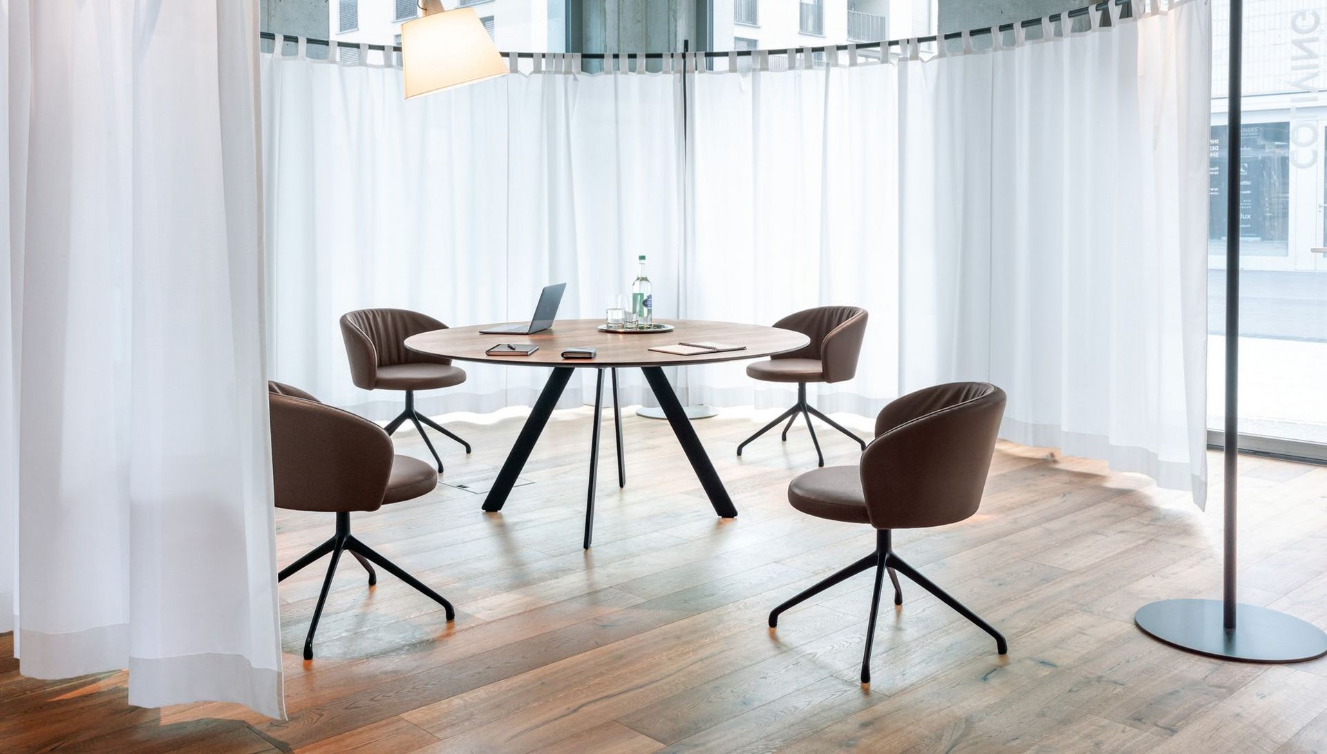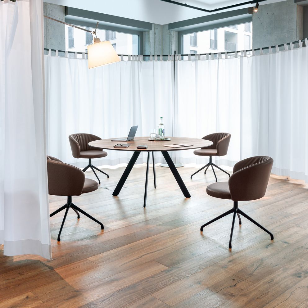 While appearing to float, the round tabletop of the Barra round table rests on a central leg made of flat steel. The angled legs provide the table with excellent stability.