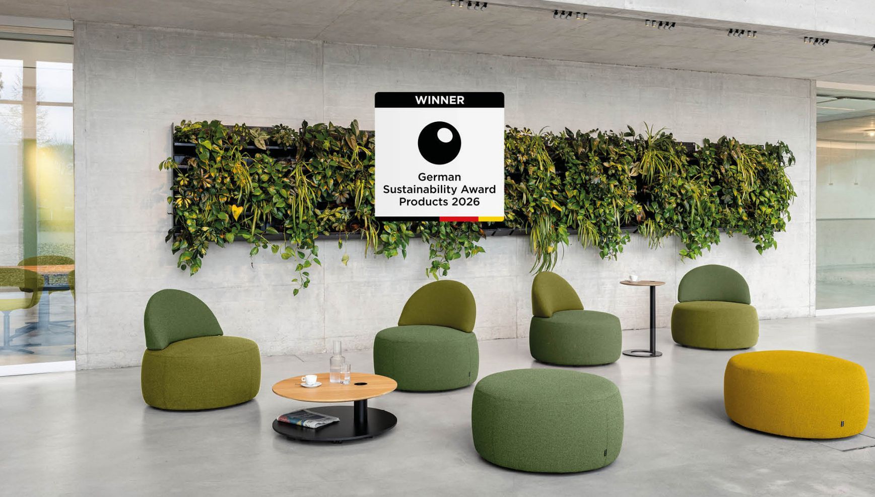 La gamme Soft Seating Incycle de Girsberger a été récompensée dans la catégorie „Produits“ du Prix allemand de la durabilité 2026. Le jury d’experts prestigieux a ainsi récompensé des produits qui contribuent de manière particulièrement efficace à une transformation durable dans l’un des cinq domaines de transformation centraux: climat, ressources, nature, société et chaine de création de valeur. La gamme de sièges Incycle convainc par son concept axé sur l’économie circulaire. En effet, dès la phase de développement, l’accent est porté sur la réutilisation des matériaux. En fonction du module, 90 à 95 % des matériaux récupérés pour la fabrication des poufs sont des matériaux usagés et recyclés.