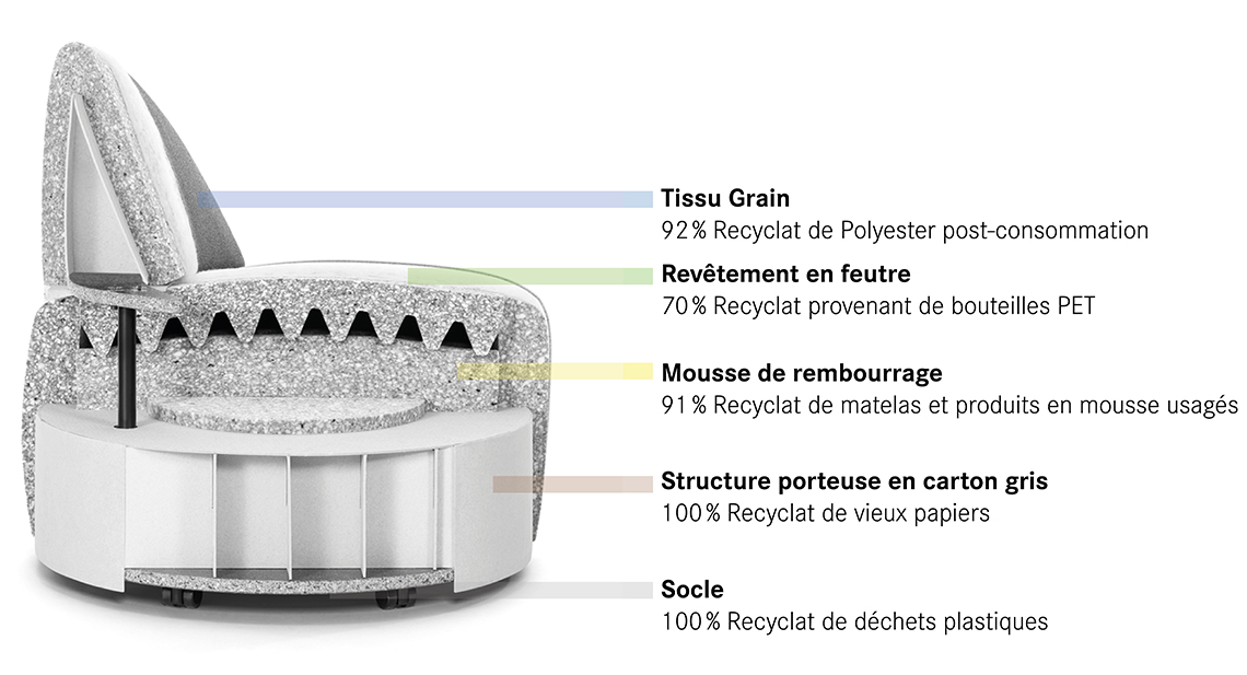 Le programme modulaire est composé de 90 à 95 % de matériaux recyclés post-consommation, notamment de mousse provenant d’anciens matelas, de plaques de socle en plastique mélangé usagé, de structures en carton gris obtenues à partir de papier recyclé, ainsi que de matériaux de rembourrage et de tissus d’ameublement en PET recyclé. Le site de production en Allemagne s’approvisionne en matériaux qui proviennent de fournisseurs situés dans un périmètre maximal de 600 kilomètres alentour et qui peuvent être réintroduits dans le cycle à la fin de leur phase d'utilisation.“