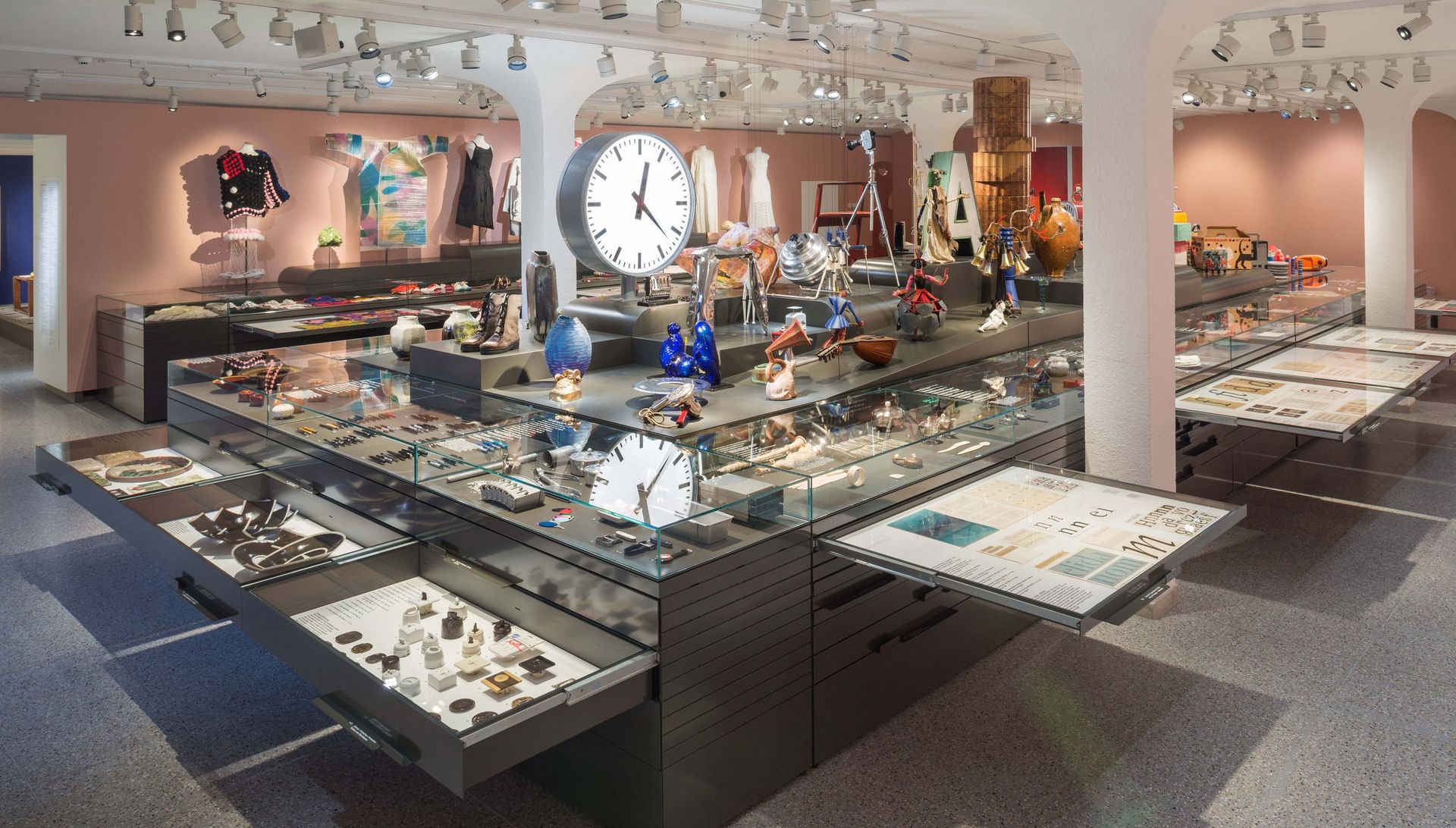 De beaux objets utiles et/ou curieux du quotidien peuvent y être admirés. Un meuble d'archivage en acier conçu par Alfredo Häberli et mis en œuvre par Girsberger comptant 130 tiroirs coulissants dans toutes les directions et des vitrines en verre offre l'occasion idéale de découvrir les pièces de la collection et de s'émerveiller devant l'une ou l'autre.