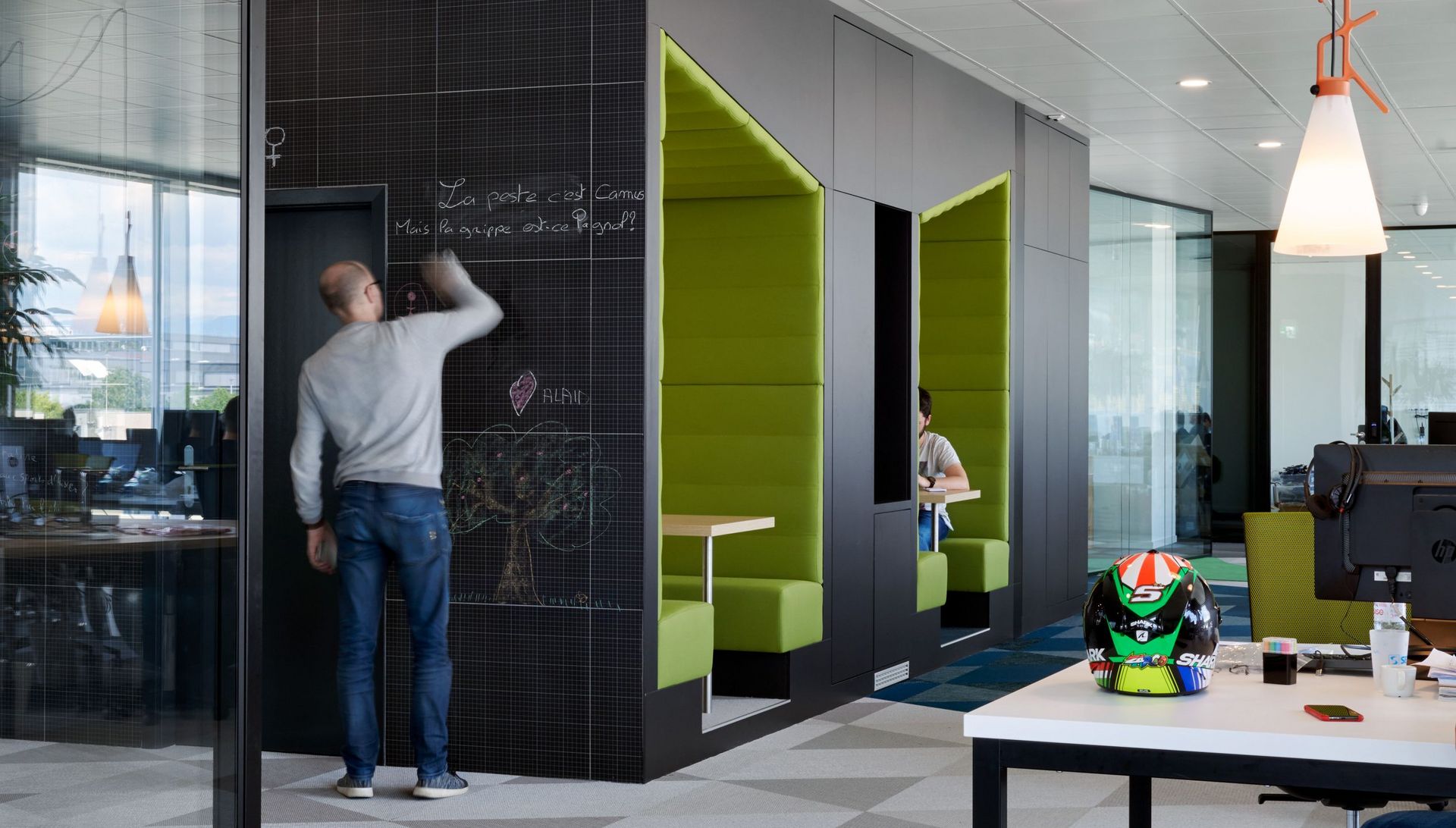 un coin cuisine, cellules intégralement capitonnées pour une isolation acoustique efficace avec des petites tables pour les réunions en comité restreint, tables de travail sur mesure avec découpes pour l’intégration de plantes, podium en bois sur trois niveaux, cloisons de séparation visuelle