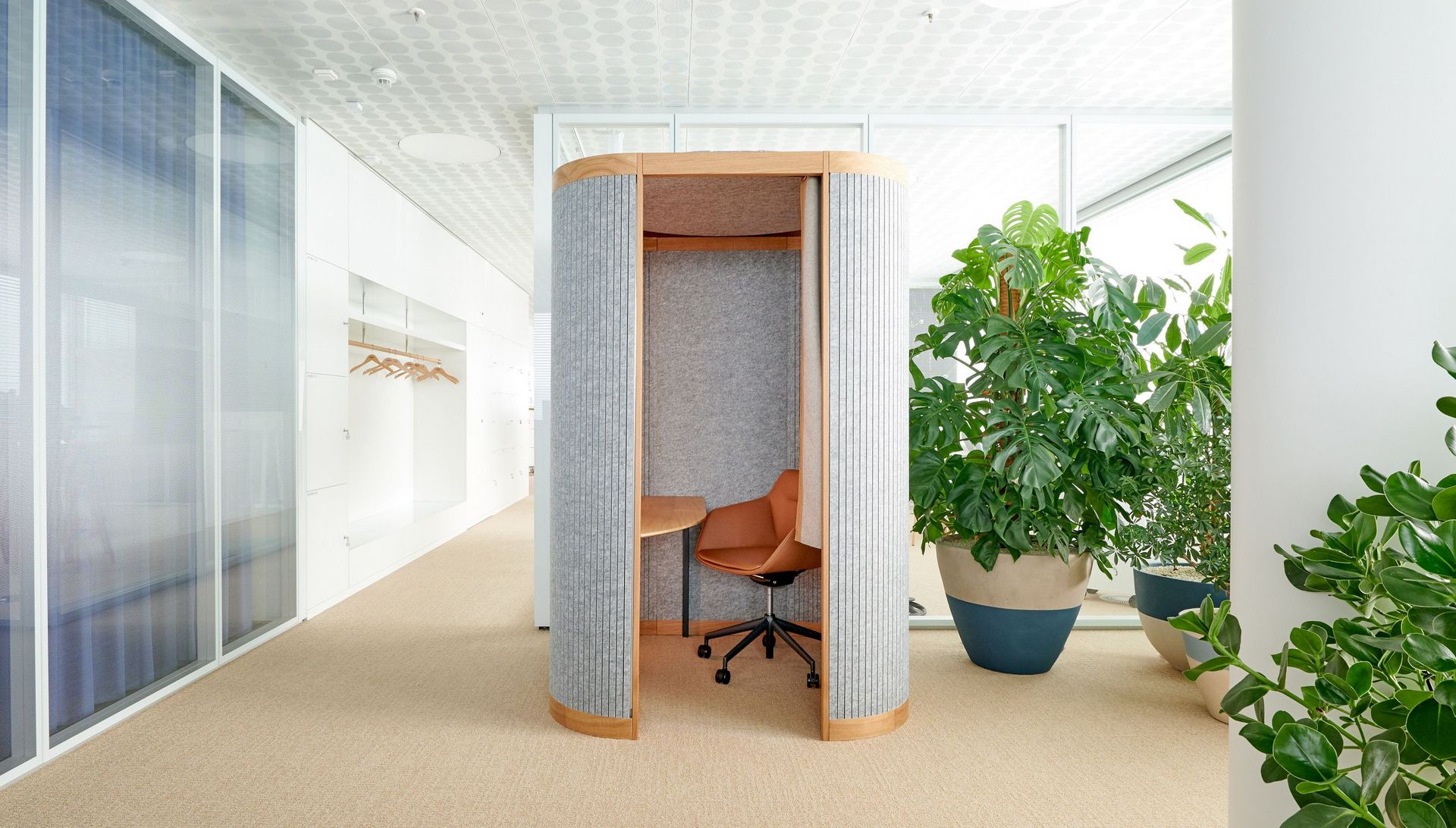 Les cabines de retrait modulaires absorbent les sons, offrent un poste de travail ergonomique, un éclairage optimal ainsi qu’une alimentation en électricité et en réseau. À l’intérieur du module, il règne une atmosphère feutrée aux tonalités neutres. Une protection visuelle et acoustique, un éclairage intégré, ainsi qu’une surface de travail agréable au toucher, permettent une bonne qualité de travail.