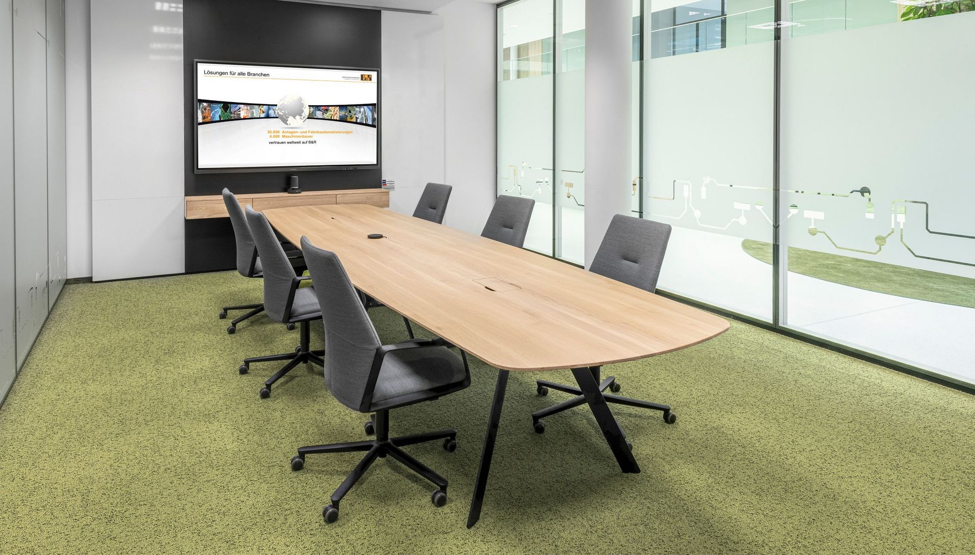 Les espaces de réunion ont été équipés de tables Barra Work avec des plateaux en chêne massif, dotées de clapets multimédias. Dans les salles de formation et de travail, les sièges pivotants Yanos et des sièges à piétement luge Connexion ont été privilégiés.