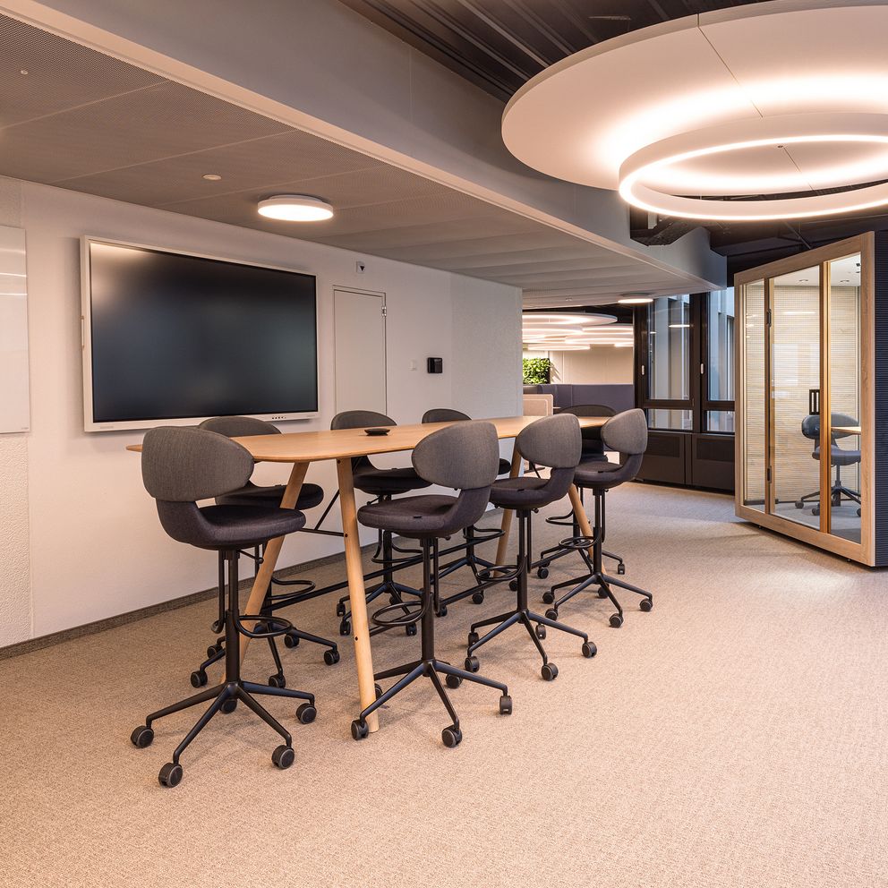 Des postes de travail ont été installés dans un environnement harmonieux, permettant une utilisation flexible grâce au zonage. Les espaces destinés aux réunions ont été conçus comme des unités modulaires qui peuvent être démontées et remontées au gré des besoins à l'endroit souhaité. Ainsi, tous les espaces - postes de travail, cabines de réunion, zones créatives et zones de retrait - peuvent être modulés et adaptés à de nouvelles utilisations sans toucher à l’infrastructure.
