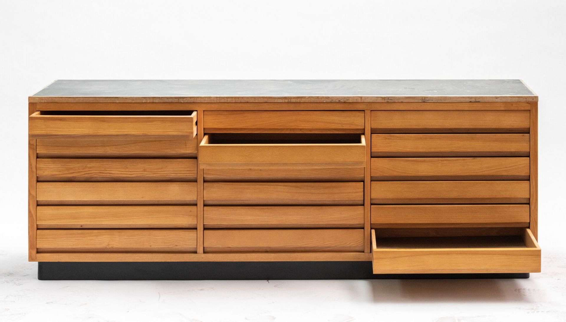 Les armoires à tiroirs des salles d'arts plastiques ont été entièrement rénovées: Les caissons ainsi que tous les tiroirs ont été poncés et recouverts d'une laque de protection.