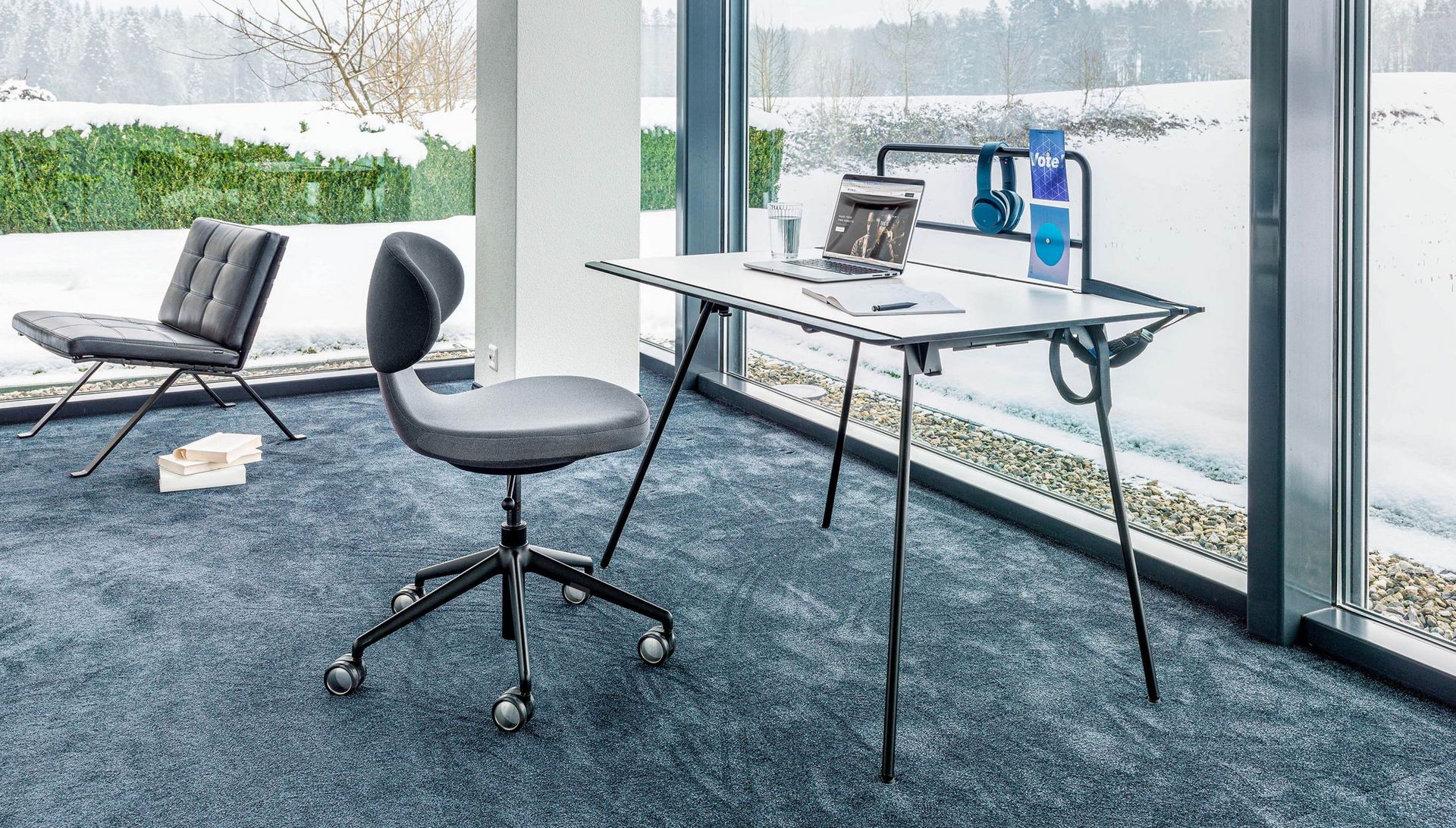 Une rehausse du même matériau vient compléter l’ensemble et peut être utilisée dans deux positions - soit en tant que pare-vue, permettant notamment d’y fixer des notes, soit en tant que tablier frontal. Cette nouvelle proposition de meuble intelligente est désormais à la disposition des collaborateurs, en tant que mobilier nomade pour le travail à domicile.