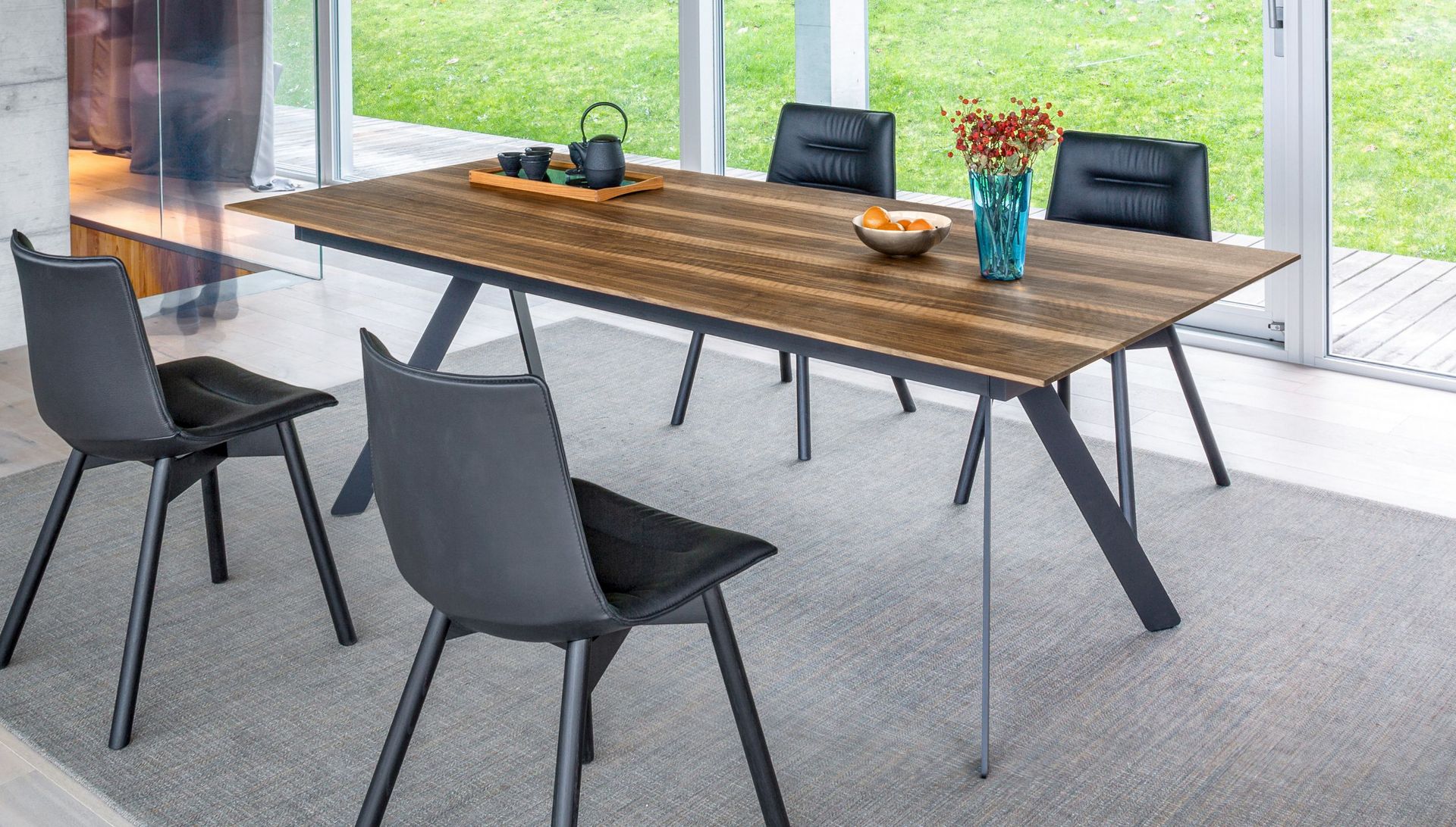 Grâce à un système à coulisse synchrone, le plateau de la table se déploie de manière égale vers les deux extrémités. Le plateau de table de 28 mm d'épaisseur ainsi que l'allonge sont issus d'une seule planche, de sorte que le veinage du bois se prolonge sur toute la longueur de la table. La technologie d'extraction synchrone est identique à celle de notre table coulissante Bela.