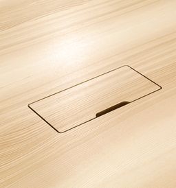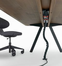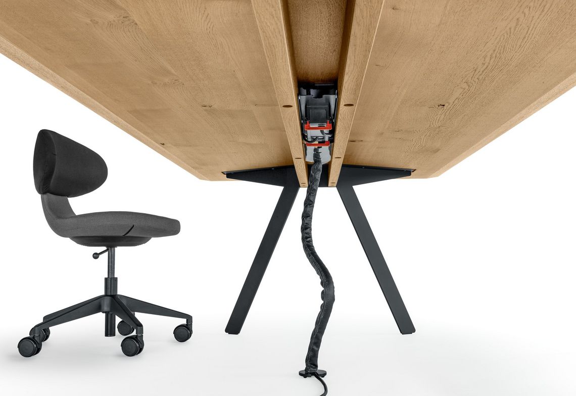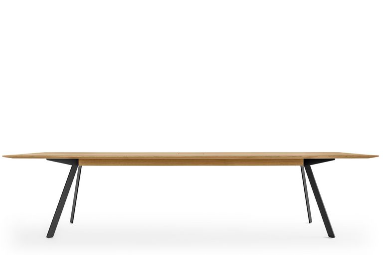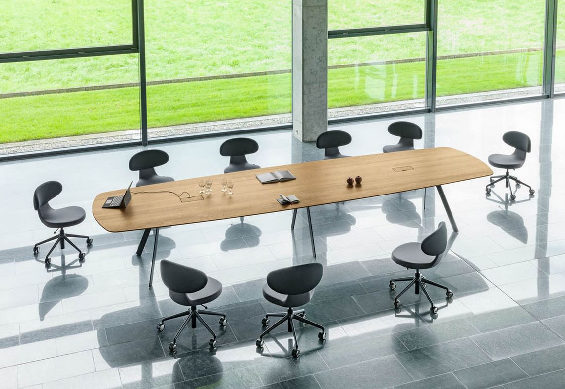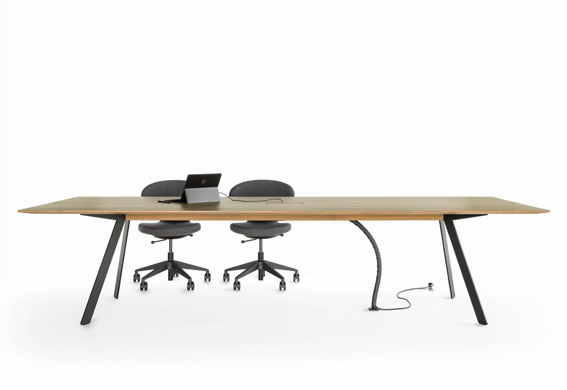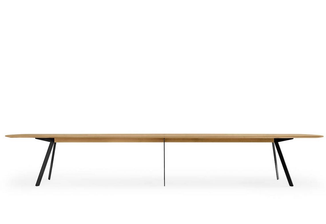 Barra combine réduction formelle et logique constructive. Le plateau de table, qui semble flotter, repose sur deux longerons médians en bois massif qui supportent le plateau de la table et à leurs extrémités les deux paires de pieds. L’espace situé entre les deux longerons permet de dissimuler la goulotte passe-câbles et les éléments nécessaires à l’équipement multimédias. Les tables conviennent principalement aux espaces de conférence. Mais Barra Work peut également être utilisée en tant que table de travail universelle ou poste de travail d'équipe.