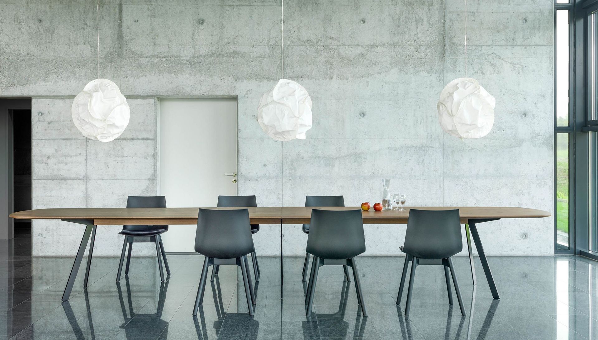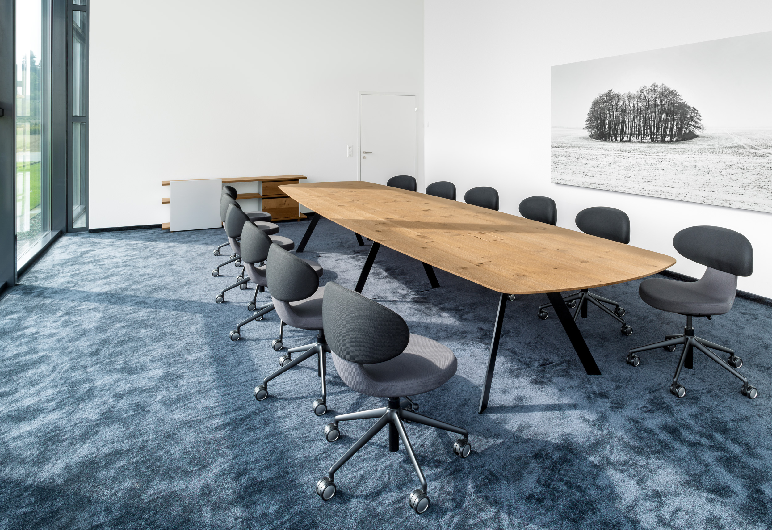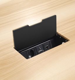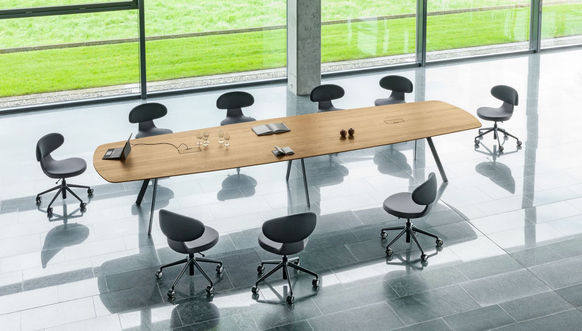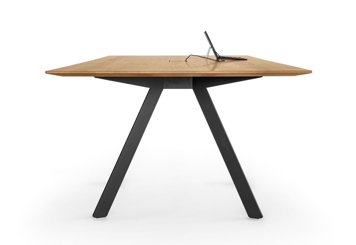 Barra combine réduction formelle et logique constructive. Le plateau de table, qui semble flotter, repose sur deux longerons médians en bois massif qui supportent le plateau de la table et à leurs extrémités les deux paires de pieds. L’espace situé entre les deux longerons permet de dissimuler la goulotte passe-câbles et les éléments nécessaires à l’équipement multimédias. Les tables conviennent principalement aux espaces de conférence. Mais Barra Work peut également être utilisée en tant que table de travail universelle ou poste de travail d'équipe.