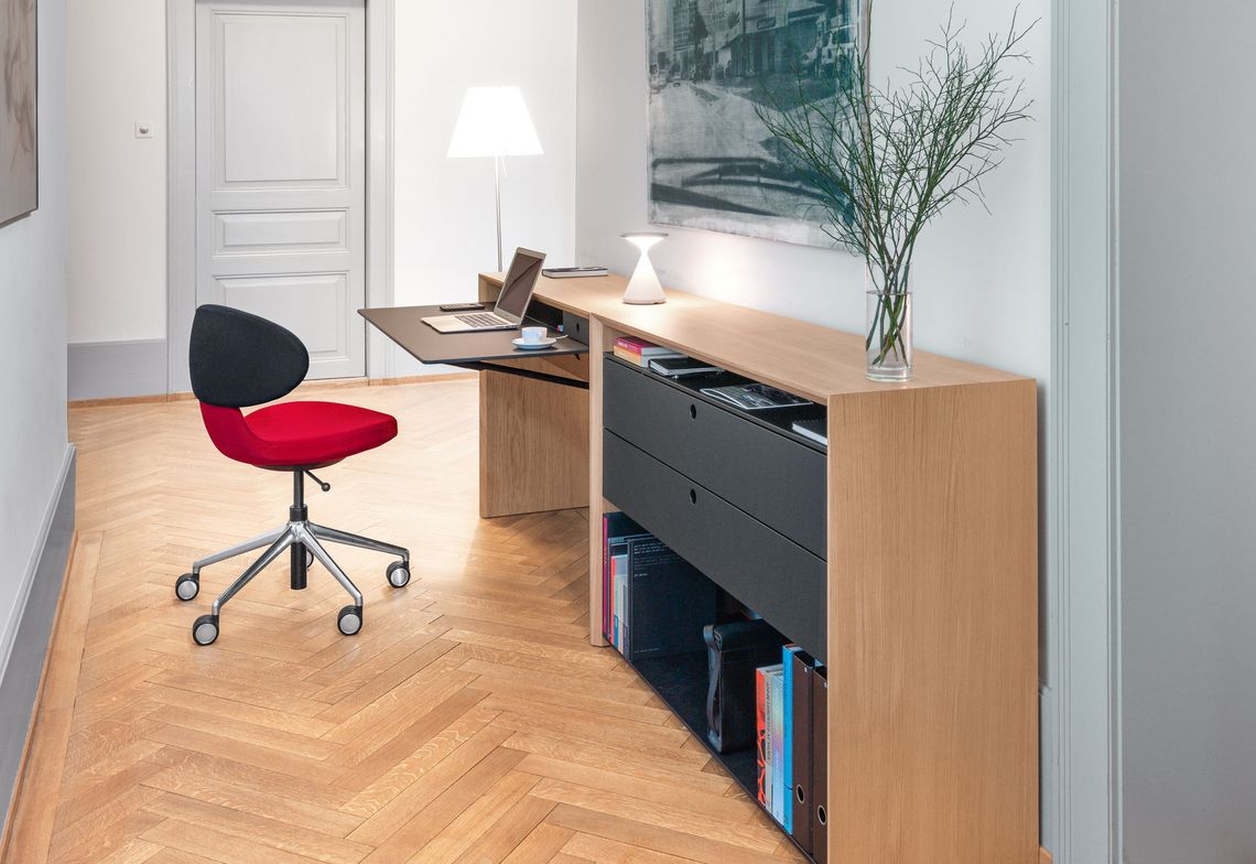 Lorsque le meuble La Punt est fermé, sa profondeur n’atteint que 40 cm. Une fois le plan de travail déplié, on obtient une grande surface de travail d'une profondeur de 80 cm avec beaucoup d'espace de rangement.