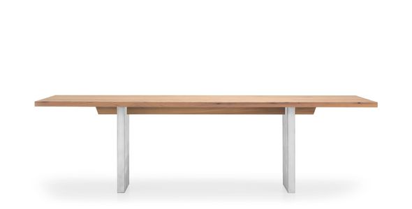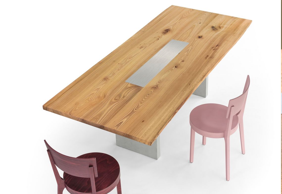 Table à manger sur des socles en béton avec des planches en bois massif marquantes et un insert en acier inoxydable.