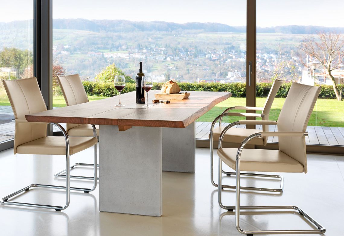 La forme du plateau met en évidence la croissance naturelle du tronc de l'arbre. L'insert en acier chromé nickelé offre un avantage fonctionnel : Il est résistant à la chaleur et à la saleté. Deux solides joues en béton, associées à une traverse médiane en bois, constituent la structure porteuse et confèrent à la table la stabilité souhaitée.