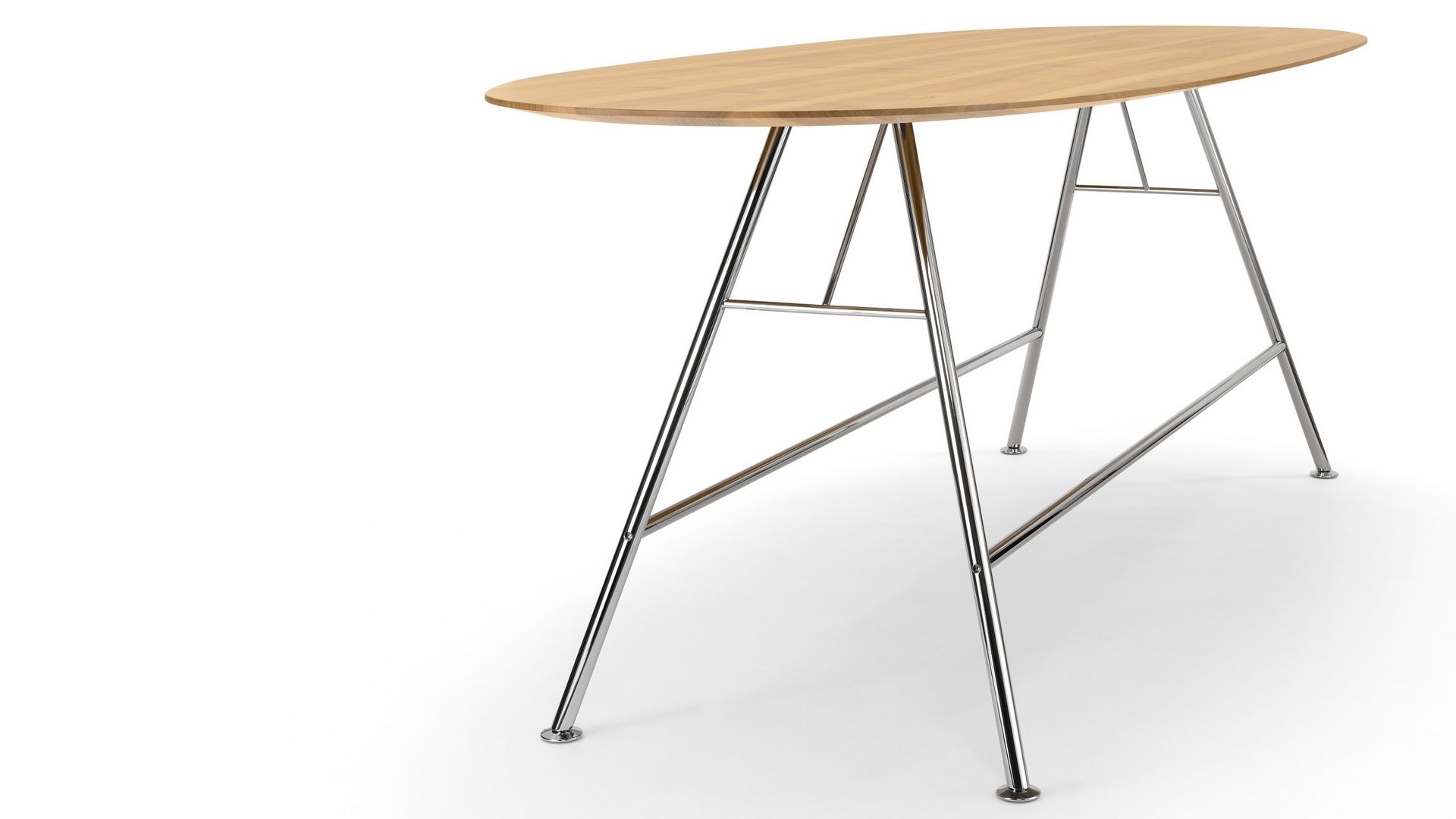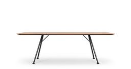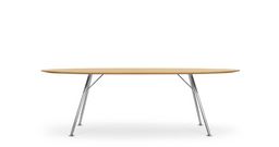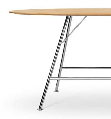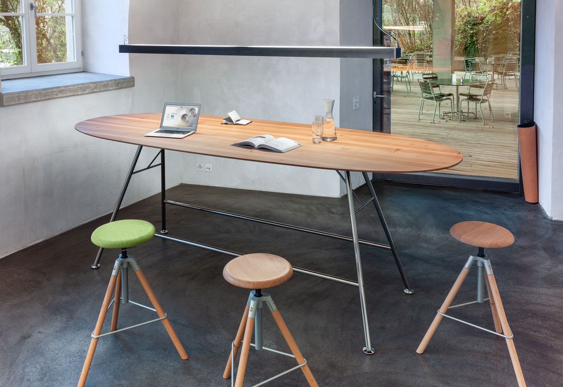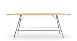 Akio Steel High est une variante de la gamme de tables Akio High et est dotée d’une structure en acier tubulaire. L'aspect filigrane est dû aux pieds d'un diamètre de 35 mm. Différentes formes et dimensions de plateaux en chêne ou noyer ainsi que des équipements multimédias sont possibles. Une version de hauteur normale est également disponible. Le piétement est chromé ou laqué noir époxy.