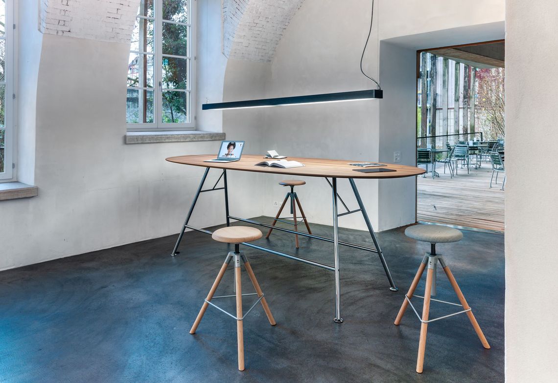 Table haute Akio Steel en combinaison avec le tabouret d’atelier Modell 112
