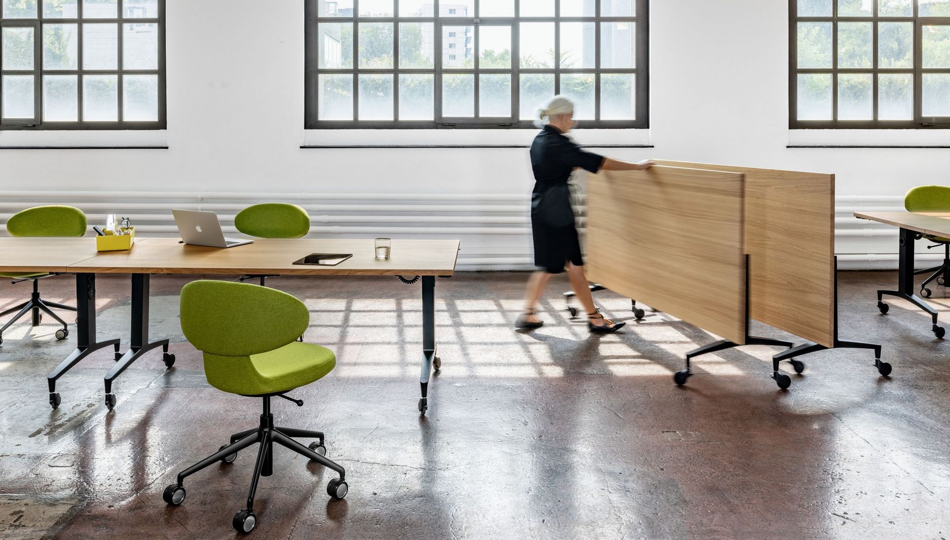 Girsberger présente une gamme de tables rabattables polyvalentes "Alteo" avec plateau en bois massif. Ce meuble sur roulettes, très mobile, peut être déplacé aisément et confortablement et disposé au gré des besoins. Il est idéal dans un environnement de bureau performant et axé sur la communication, qui requiert un aménagement modulable en fonction de l'activité. Le plateau de table peut être relié aux tables attenantes et se replie à la verticale. Le piétement est encastrable et peut être doté d'un système d'électrification.