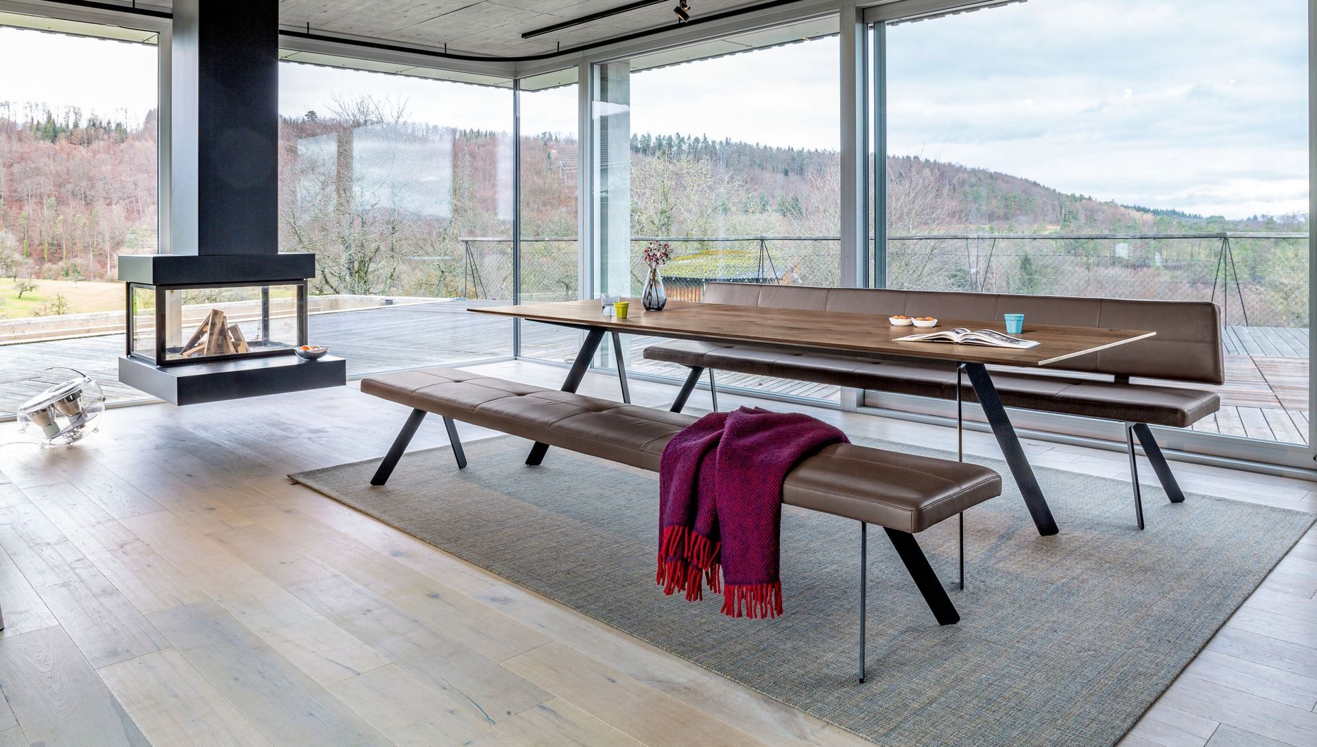 Carim est une banquette rectiligne et élégante qui peut être équipée au choix d'un piétement compas ou d'un piétement traineau. Elle est déclinée avec ou sans dossier dans des longueurs de 180 cm, de 220 cm, 240 cm et 280 cm. La version avec piétement compas se combine parfaitement avec la table Barra. La variante à piétement traineau permet de l’associer à divers types de tables. Outre le rembourrage standard, un rembourrage capitonné, conférant à la banquette un caractère luxueux et classique, est également disponible.