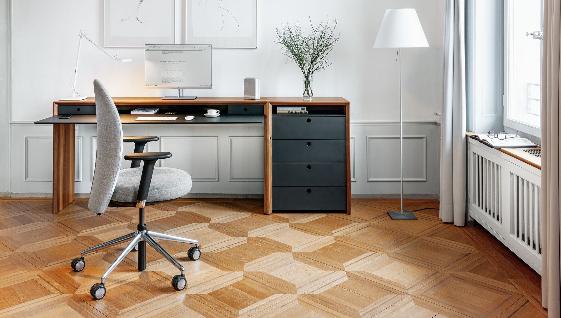 Avec le développement de ce nouveau produit, Girsberger ajoute à son offre une solution convaincante pour le travail à domicile et démontre dans un même temps son exceptionnelle expertise en matière de transformation du bois massif. L’effacement des barrières entre espace professionnel et espace privé n'a jamais été à ce point d'actualité. Girsberger propose désormais des solutions globales adaptées à cette nouvelle situation, allant des sièges pivotants ergonomiques aux tables de travail, en passant par diverses solutions de rangement.