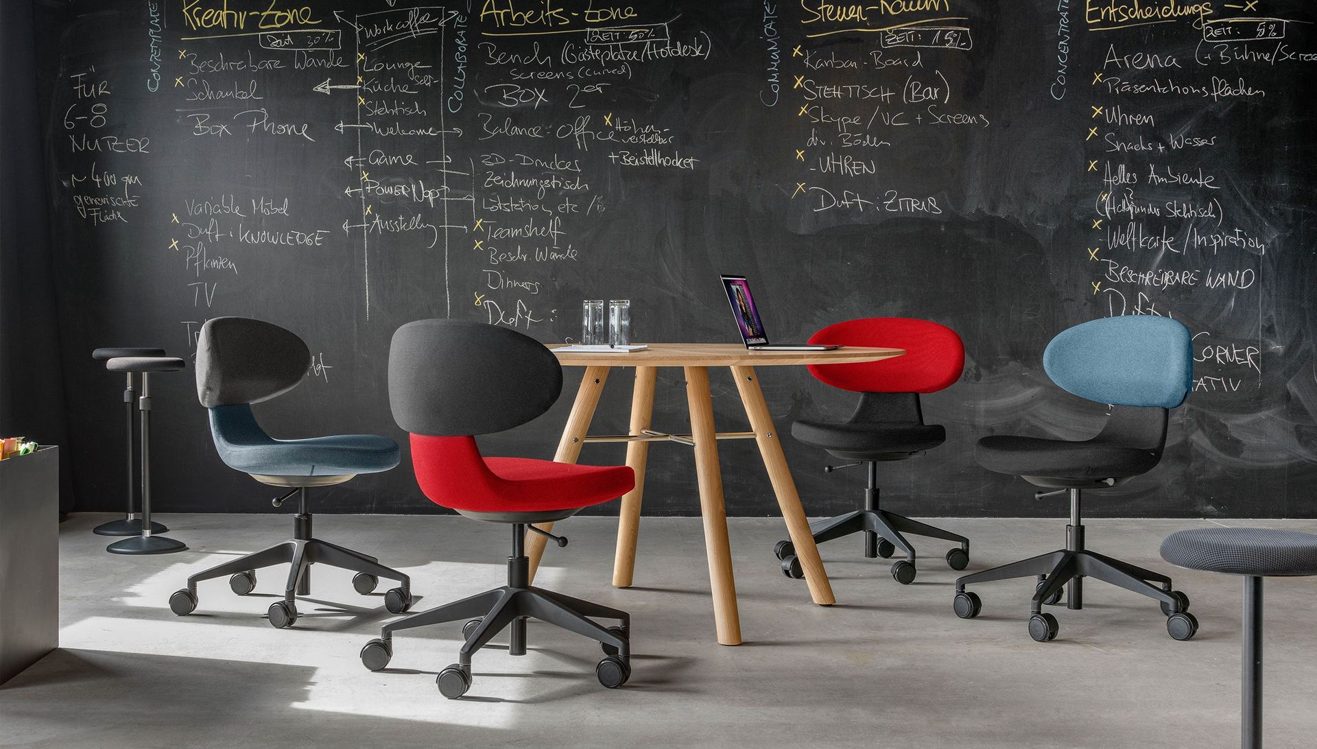 Outre les possibilités de mouvement intuitives, „Simplex 3D“ apporte une sensation de confort dans l'environnement de travail. Six coloris de sièges sont proposés au choix. La jonction cintrée de l'assise et du dossier et la possibilité de marier deux teintes lui confèrent un bel effet visuel. Le piétement cruciforme est décliné en aluminium poli ou noir, de même qu’en matière synthétique noire. Une version haute équipée d’un repose-pieds est également disponible.