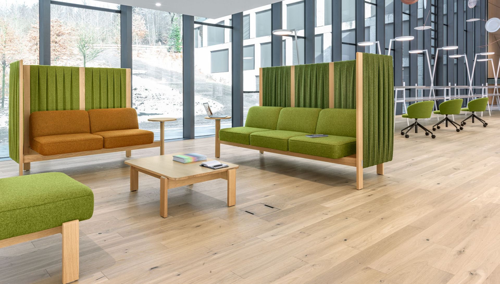 Des fauteuils monoplaces, des banquettes biplaces et trois places peuvent être reliés entre eux par des panneaux de liaison, de manière à former une microarchitecture. Des poufs et des tables d'appoint ainsi que des tables de travail complètent le système d'ameublement. Le chêne est le matériau utilisé et une sélection de tissus adaptés à cet usage et provenant de la collection Girsberger est disponible pour le recouvrement des éléments d’assise et des panneaux.