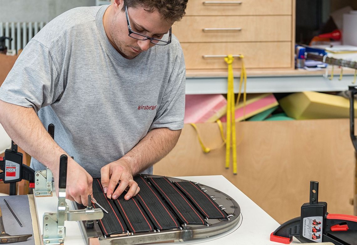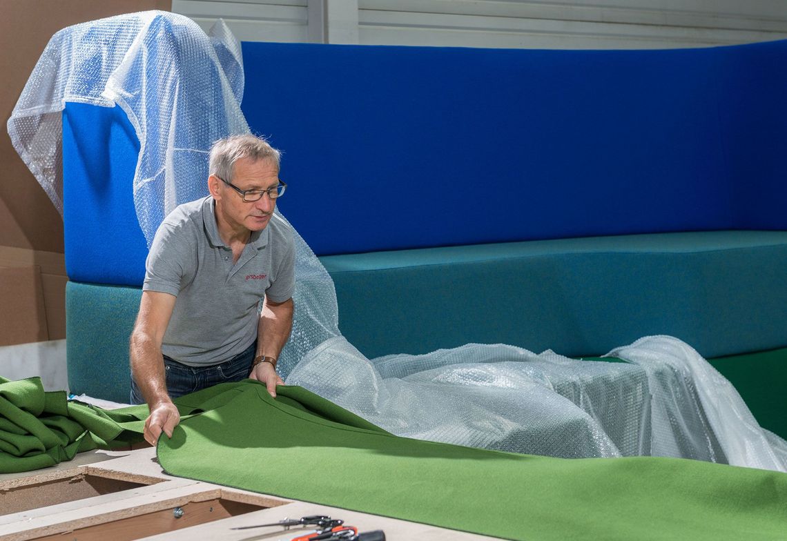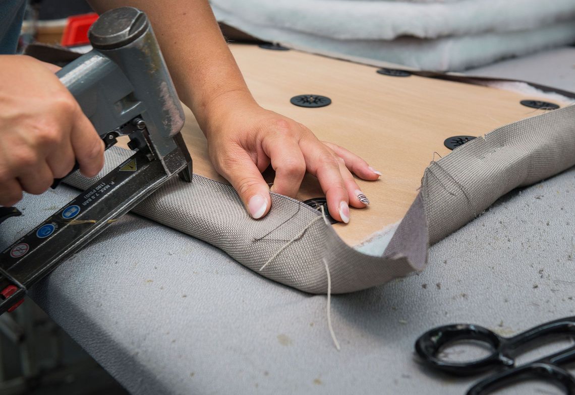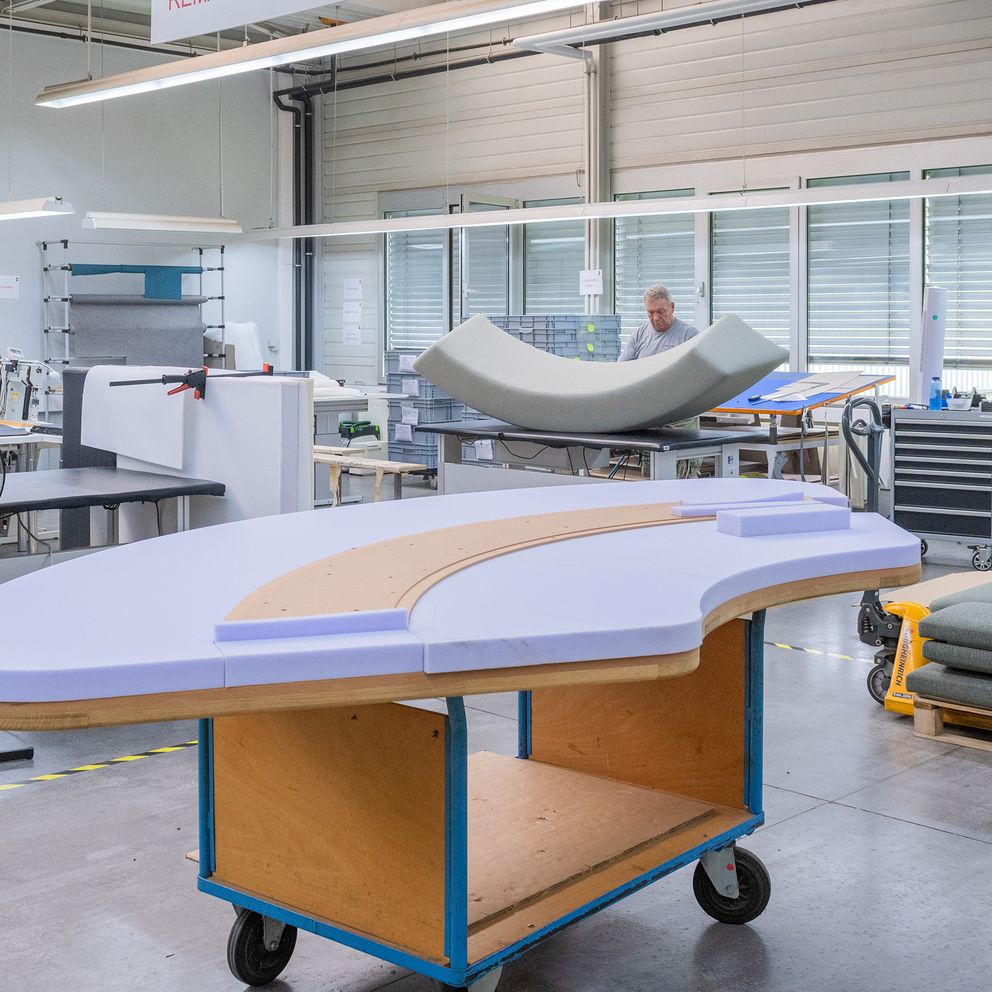 Dankzij onze serieproductie beschikken wij over een eigen efficiënte stoffeerderij. Omdat wij goed op de hoogte zijn van belastingen in een object, ontwikkelen wij hoogwaardige stofferingen in een sandwichconstructie met verschillende schuimhardheden, altijd afgestemd op uw meubelidee. Dat garandeert jarenlang een hoog zitcomfort.