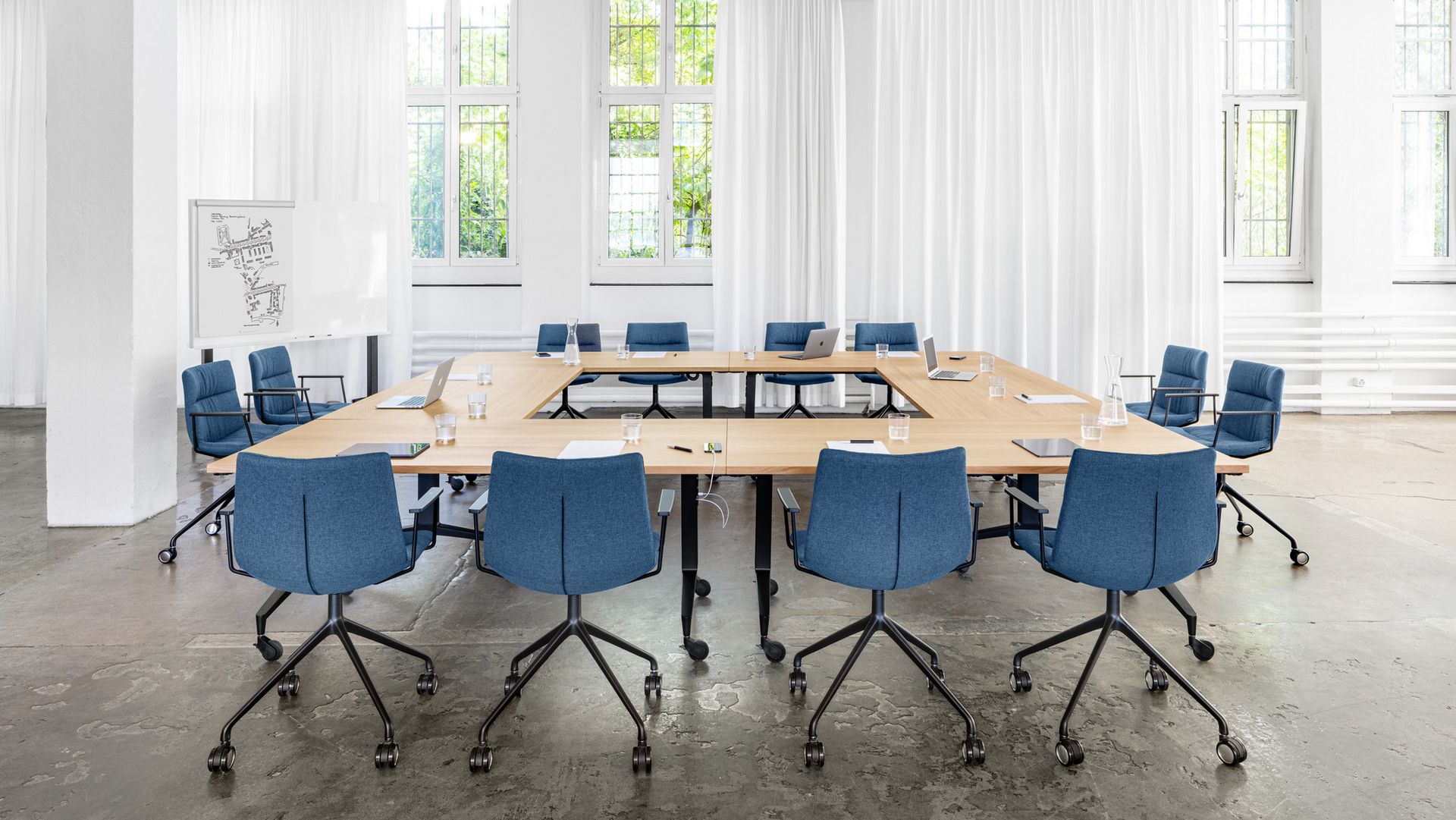 Comfort en flexibiliteit mogen niet worden opgeofferd tijdens teamwork en trainingen. Verschillende bureaustoelmodellen met een onderstel op wielen zijn hiervoor geschikt. Deelnemers kunnen snel groepen vormen en zijn mobiel op hun stoel.