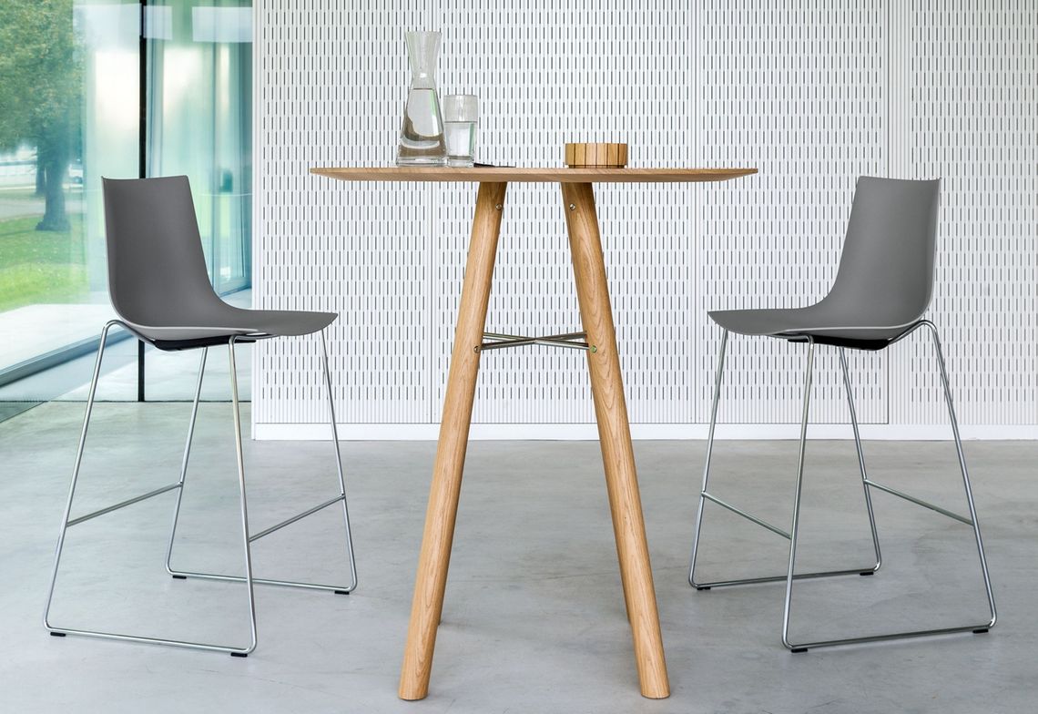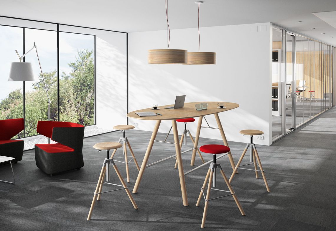 Met name hoge tafels en hoge stoelen zijn hiervoor bijzonder geschikt, omdat ze snel kunnen worden verplaatst en ontmoetingen op ooghoogte mogelijk maken terwijl men staat of zit. Bovendien zorgen zij tussendoor voor een verandering van lichaamshouding, wat ergonomisch voordelig is.