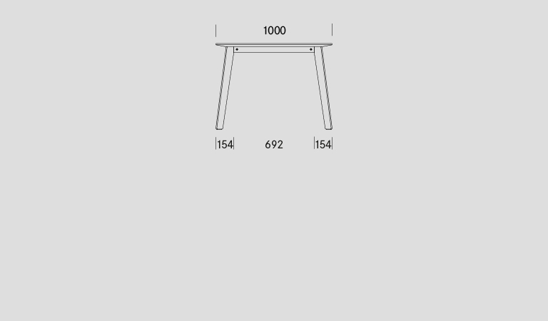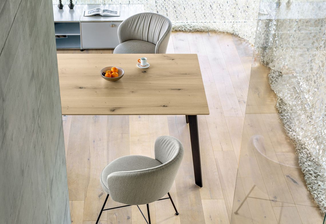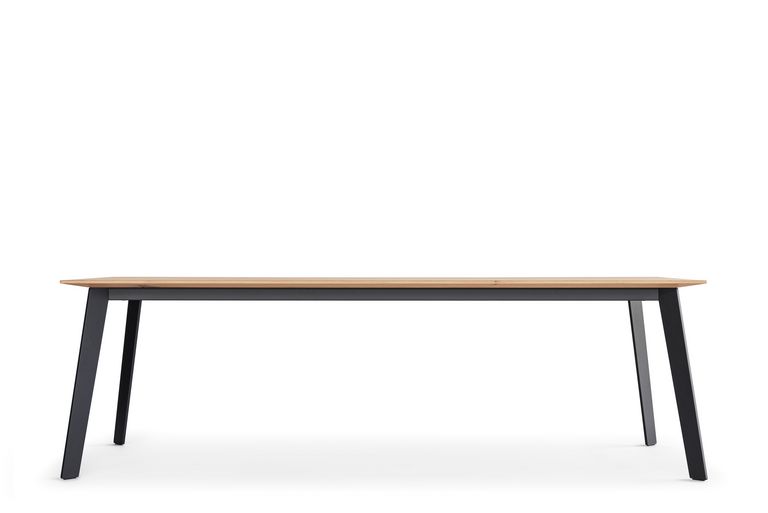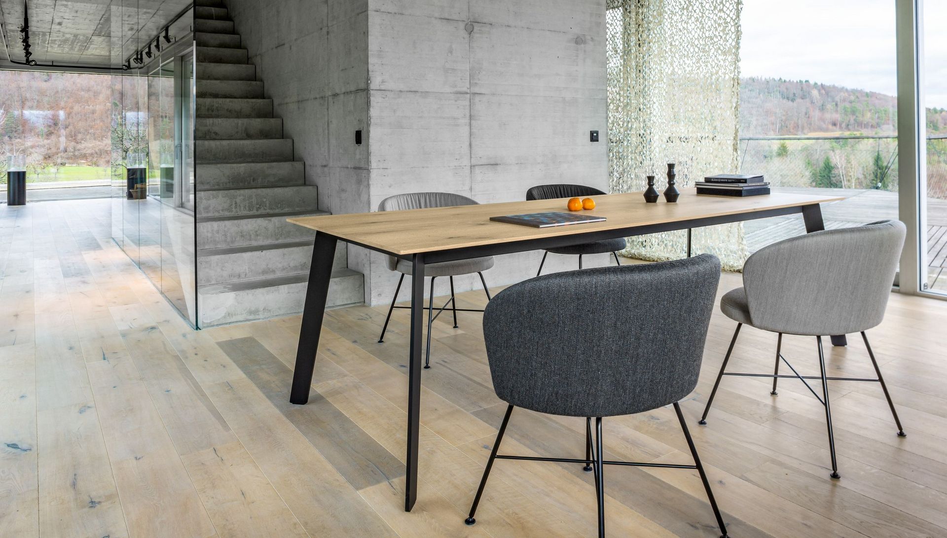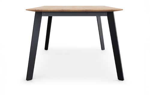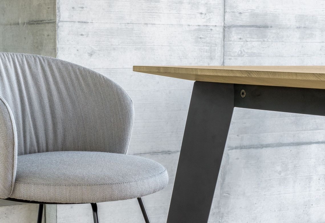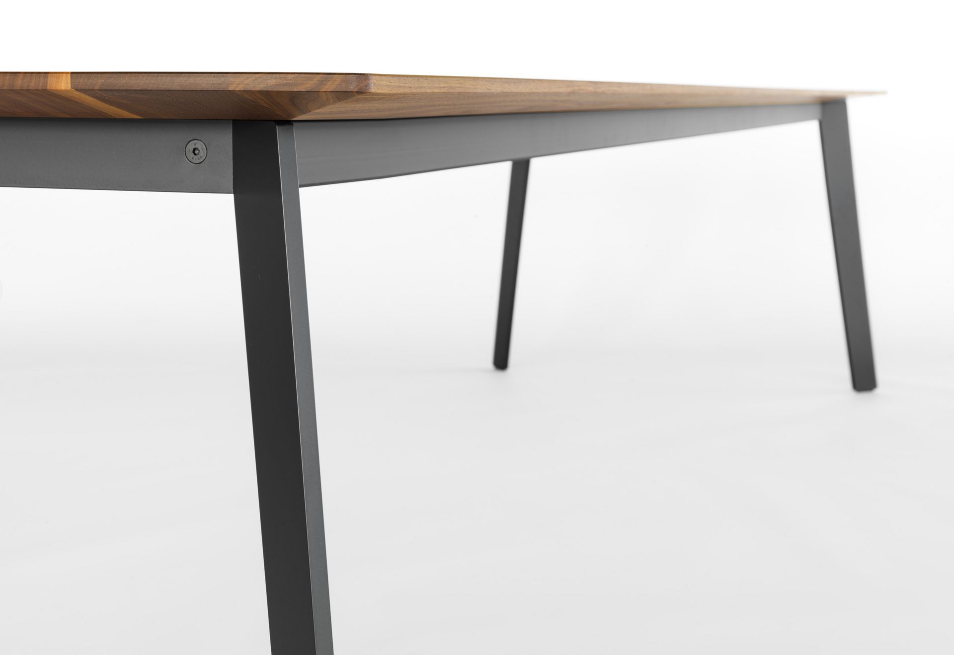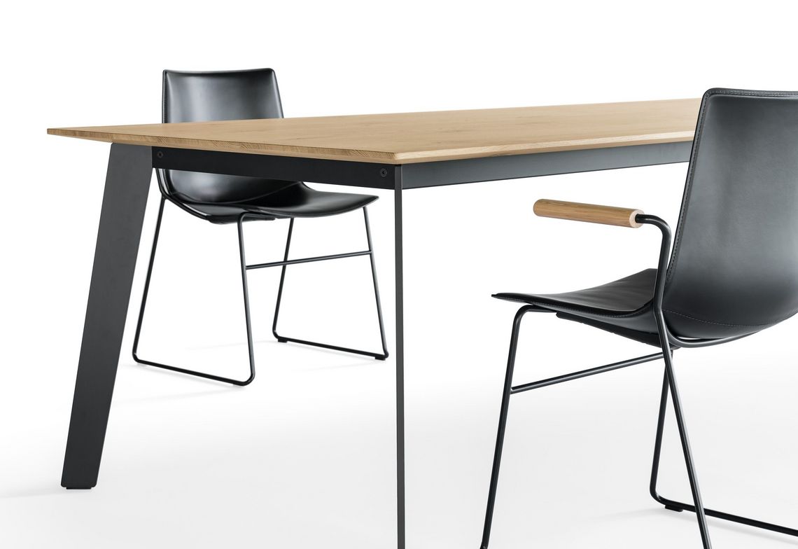 Op een warme en haptisch aangename wijze gaat het tafelblad van massief hout een optisch nauwkeurige verbinding aan met het onderstel van hard en belastbaar staal. De randen van het massief houten blad zijn naar de kant toe afgeschuind, waardoor het tafelblad net zo slank oogt als de stalen poten van 12 mm dik vlakstaal.