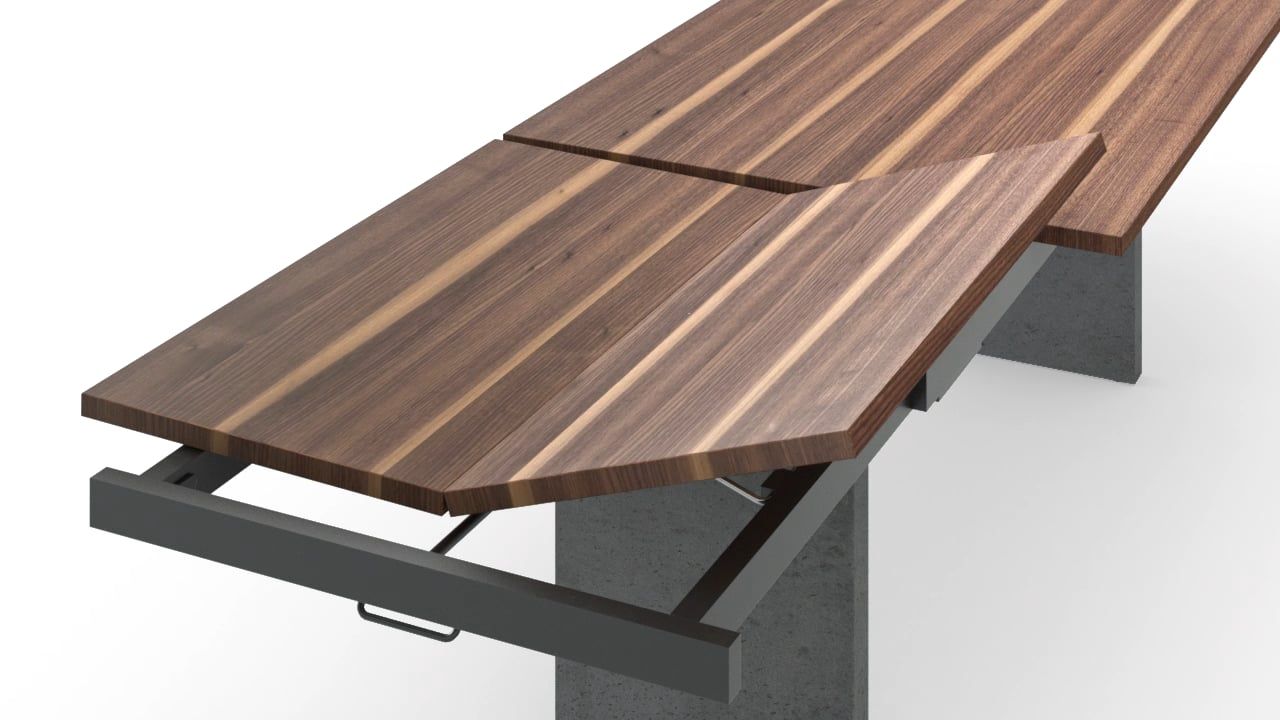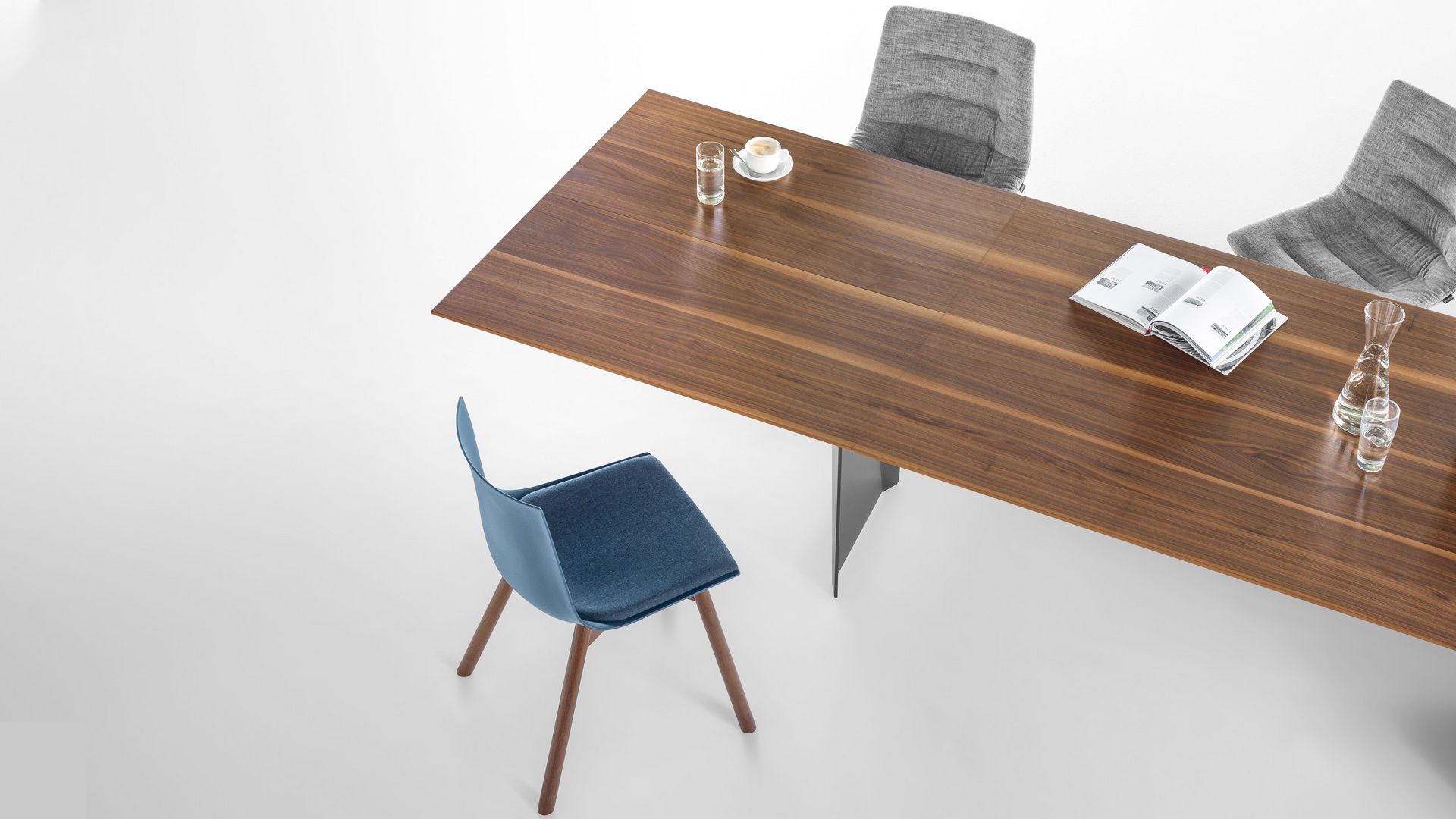 Het 28 mm dikke tafelblad en het verlengblad zijn uit één plaat vervaardigd, zodat de houtnerf doorloopt. Bela is verkrijgbaar als modulair systeem in vele uitvoeringen. Het tafelblad wordt op verzoek geleverd met randen die naar buiten toe dunner worden.