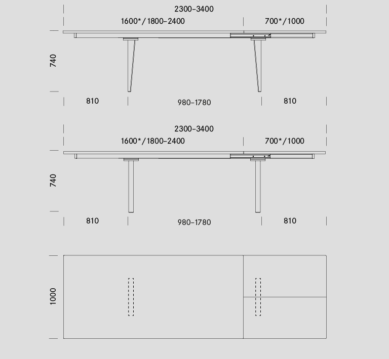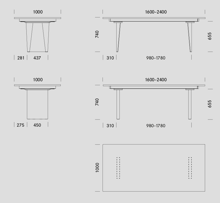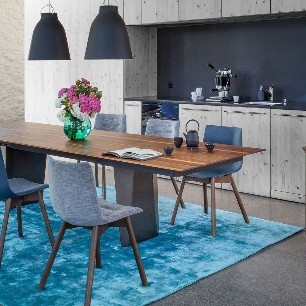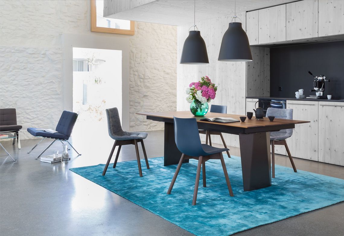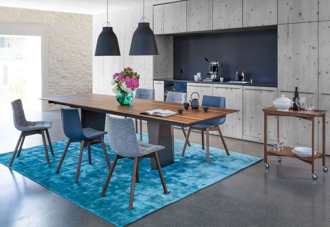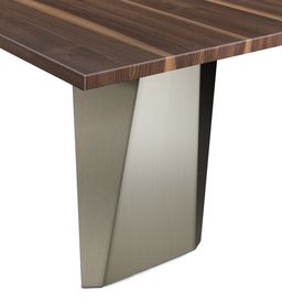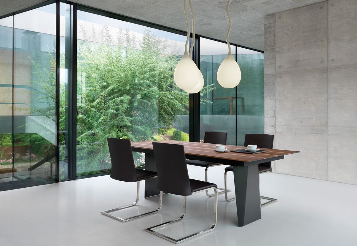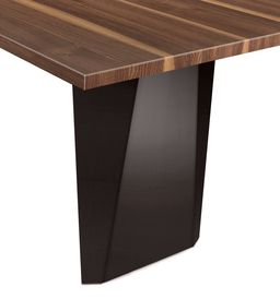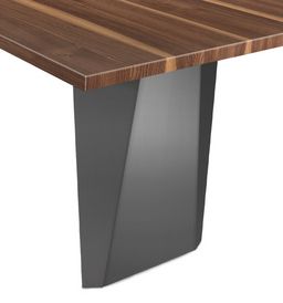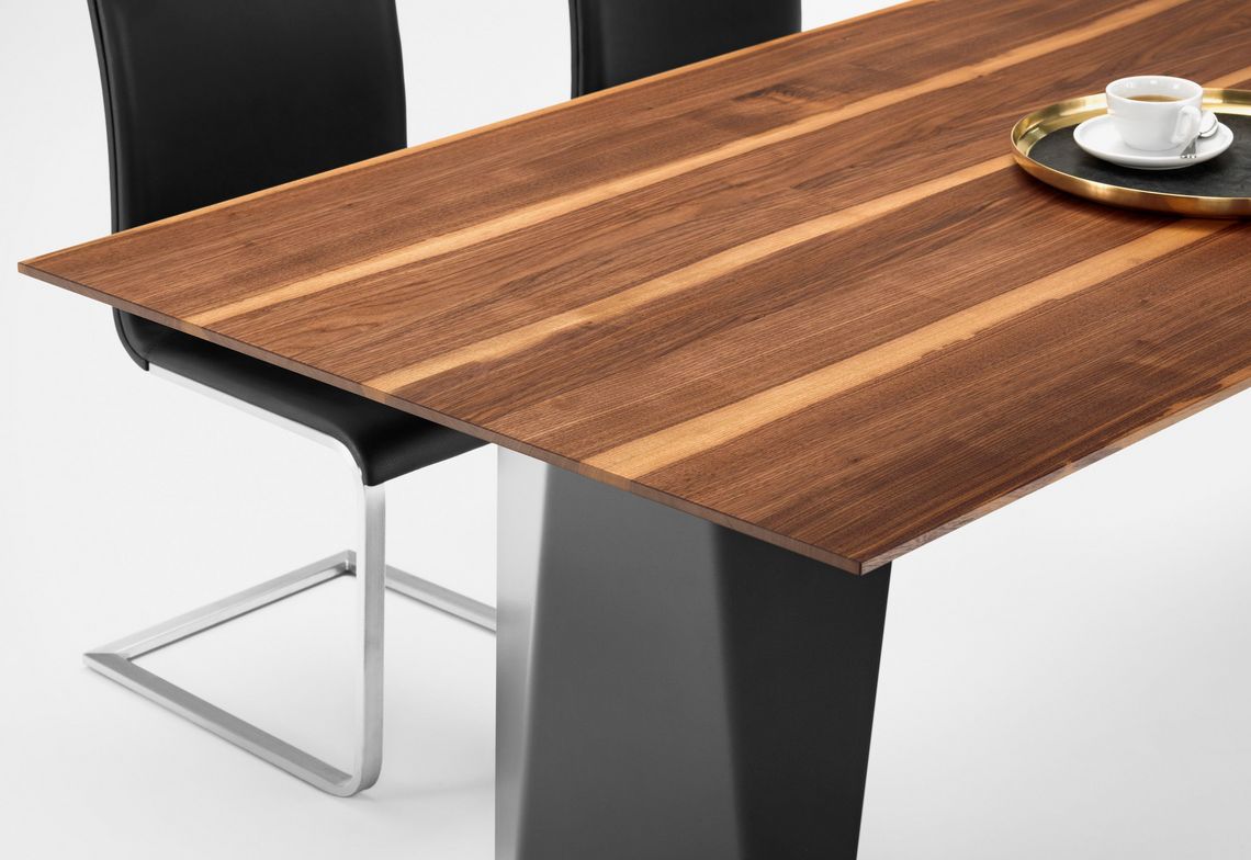 Het 28 mm dikke tafelblad en het verlengblad zijn uit één plaat vervaardigd, zodat de houtnerf doorloopt. Bela is verkrijgbaar als modulair systeem in vele uitvoeringen. Het tafelblad wordt op verzoek geleverd met randen die naar buiten toe dunner worden.