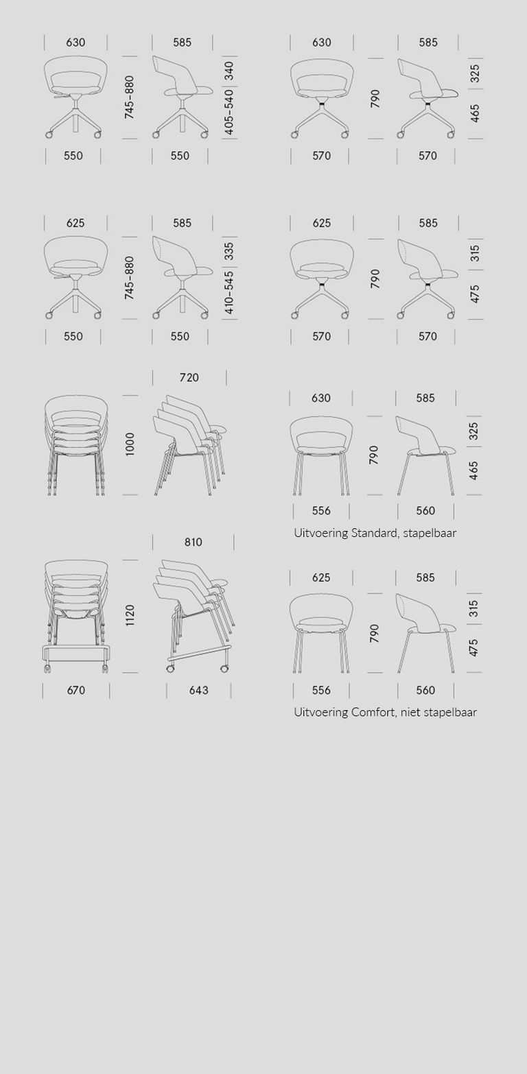Visueel opvallend: de ronde vorm bepaalt het beeld. Er zijn twee rugleuningformaten en gestoffeerde uitvoeringen als optie: Calina met een eenvoudigere gestoffeerde uitvoering, smallere rugleuning en het voordeel van stapelbaarheid dat daaruit voortvloeit. Of als comfort-uitvoering met een rugleuning met een groter oppervlak, dikkere en verticaal lopende plooien in de bekledingsstof. Die zorgt voor een bijzonder zacht en comfortabel zitgevoel – ook voor een lang en gezellig samenzijn aan de eettafel.