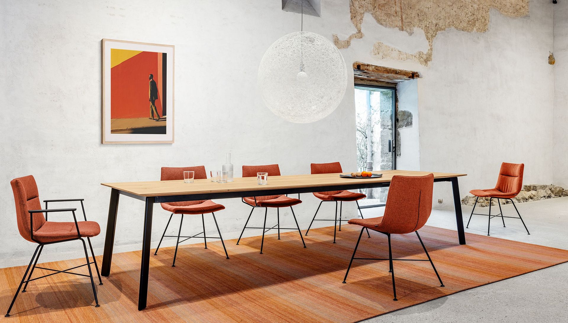 Girsberger breidt zijn portfolio van massief houten eettafels uit met een nieuwe uitschuiftafel. Dankzij een eenvoudig te bedienen mechaniek kan Liola zonder krachtsinspanning aan één zijde een meter worden verlengd. Wordt het uitklapblad losgelaten, glijdt het geruisloos en gedempt naar beneden tot op gelijke hoogte met het tafelblad. Het ontwerp komt van Mathias Seiler, die niet alleen een variant in massief hout heeft gemaakt, maar ook een oplossing met een uitklapblad van zwart MDF.